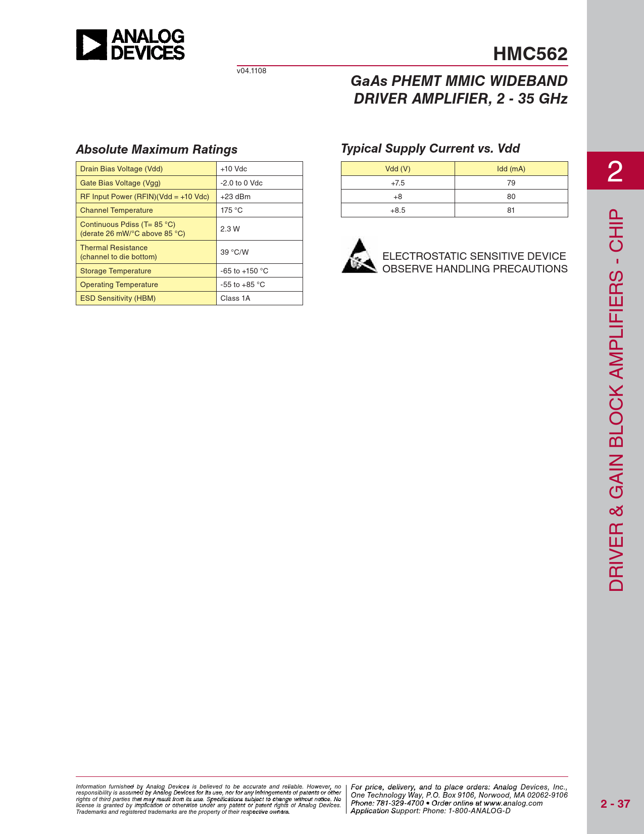 HMC562. GaAs PHEMT MMIC WIDEBAND. DRIVER AMPLIFIER, 2 - 35 GHz. Absolute Maximum Ratings. Typical Supply Current vs. Vdd. 2 - 37