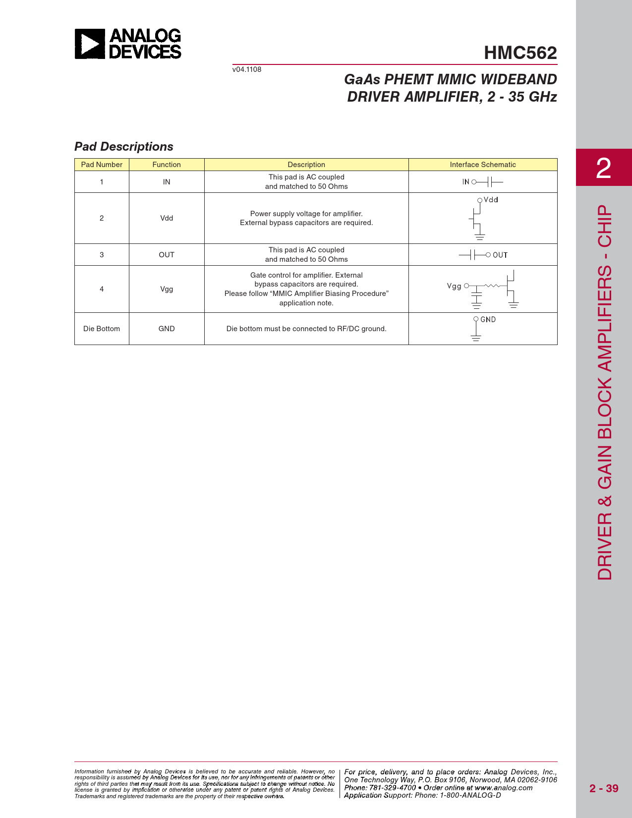 HMC562. GaAs PHEMT MMIC WIDEBAND. DRIVER AMPLIFIER, 2 - 35 GHz. Pad Descriptions. 2 - 39