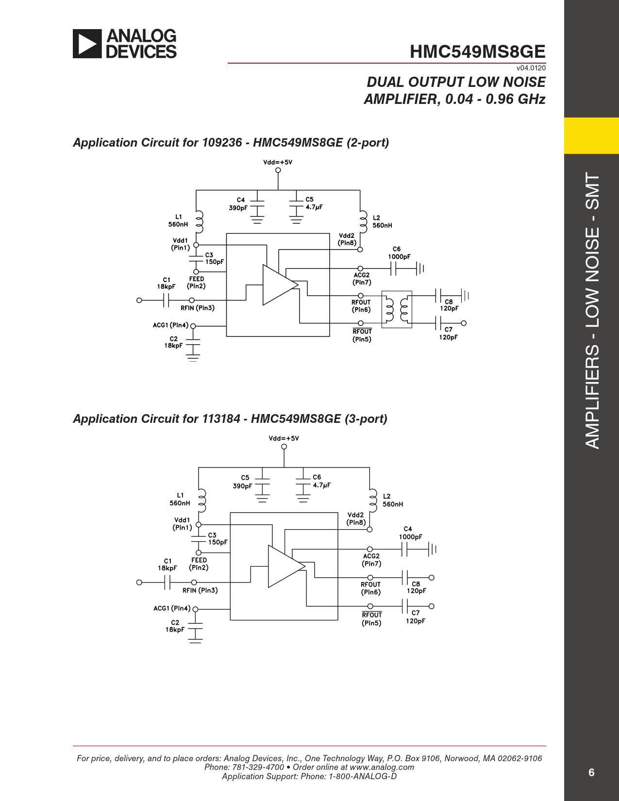 HMC549MS8GE v04.0120 DUAL OUTPUT LOW NOISEAMPLIFIER, 0.04 - 0.96 GHzApplication Circuit for 109236 - HMC549MS8GE (2-port) T M E - S IS O W N O S - L R IE LIF Application Circuit for 113184 - HMC549MS8GE (3-port) P M A For price, delivery, and to place orders: Analog Devices, Inc., One Technology Way, P.O. Box 9106, Norwood, MA 02062-9106 Phone: 781-329-4700 • Order online at www.analog.com 6 Application Support: Phone: 1-800-ANALOG-D
