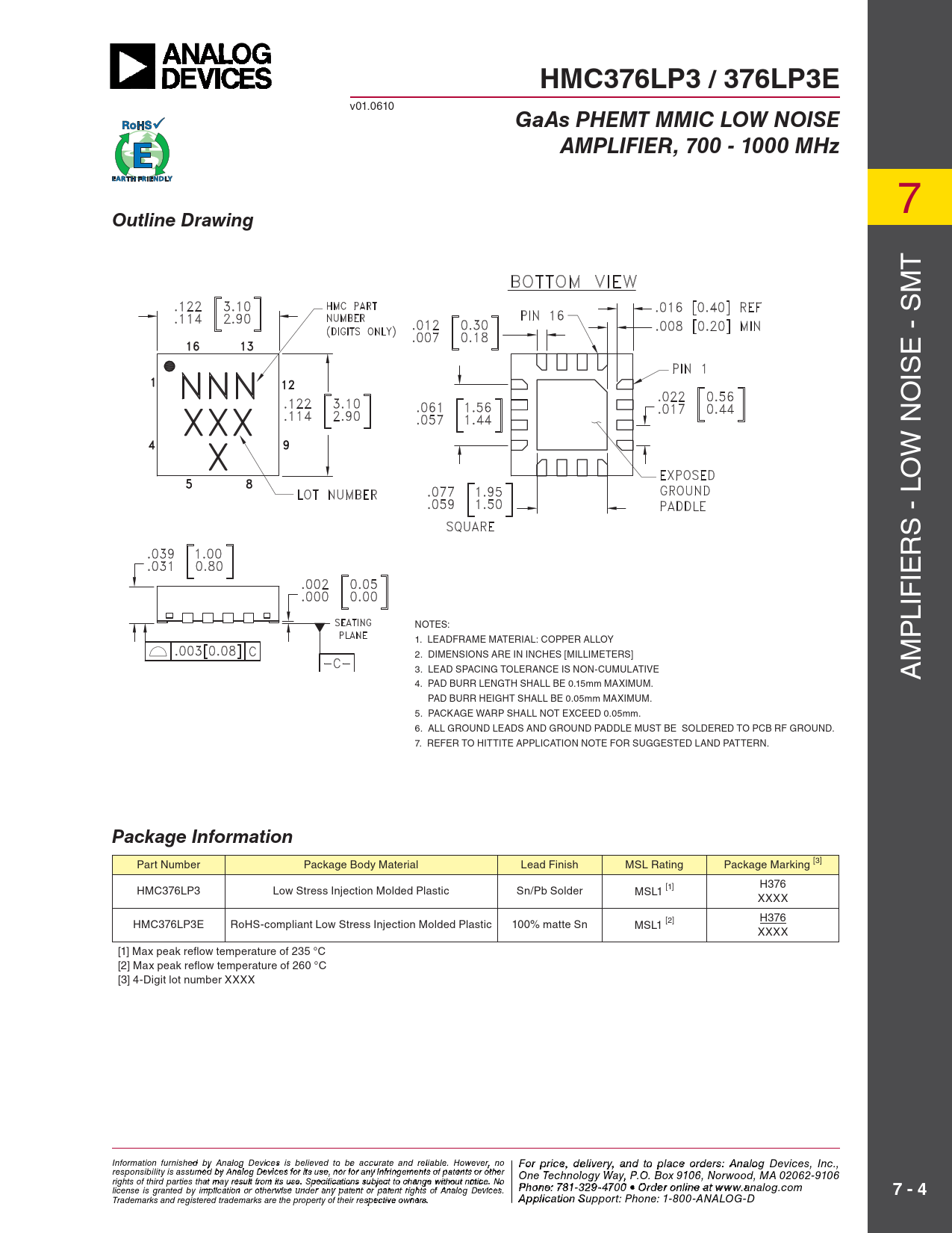 HMC376LP3 / 376LP3E. GaAs PHEMT MMIC LOW NOISE. AMPLIFIER, 700 - 1000 MHz. Outline Drawing. Package Information. 7 - 4