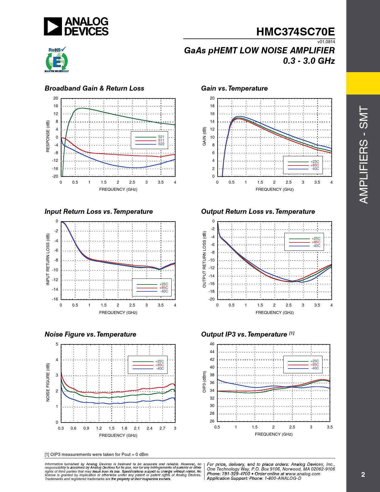 HMC374SC70E v01.0814 GaAs pHEMT LOW NOISE AMPLIFIER0.3 - 3.0 GHzBroadband Gain & Return LossGain vs. Temperature 20 20 16 18 T 12 16 8 14 m (dB) 4 12 s (dB) 0 S21 10 S11 - -4 S22 GAIN 8 s RESPONSE -8 6 r -12 4 +25C +85C ie -16 2 -40C -20 0 lif 0 0.5 1 1.5 2 2.5 3 3.5 4 0 0.5 1 1.5 2 2.5 3 3.5 4 p FREQUENCY (GHz) FREQUENCY (GHz) m A Input Return Loss vs. TemperatureOutput Return Loss vs. Temperature 0 0 -2 -2 (dB) -4 (dB) -4 +25C +85C -6 -40C -6 LOSS LOSS -8 -8 -10 RETURN -12 RETURN -10 -14 PUT -12 IN +25C -16 OUTPUT -14 +85C -40C -18 -16 -20 0 0.5 1 1.5 2 2.5 3 3.5 4 0 0.5 1 1.5 2 2.5 3 3.5 4 FREQUENCY (GHz) FREQUENCY (GHz) Noise Figure vs. TemperatureOutput IP3 vs. Temperature [1] 5 46 44 4 +25C 42 +25C +85C +85C -40C (dB) 40 -40C 3 38 GURE 36 FI 2 OIP3 (dBm) 34 SE NOI 32 1 30 28 0 26 0.3 0.6 0.9 1.2 1.5 1.8 2.1 2.4 2.7 3 0.5 1 1.5 2 2.5 3 3.5 FREQUENCY (GHz) FREQUENCY (GHz) [1] Oip3 measurements were taken for pout = 0 dBm InformatioFn ofur p rnis rhiec d eb, d y A e n l al iovg eDrey a vice n s id t s b o p eliev lea d c t e o o be rd acc eurrast: A e an n d a re llioag D ble. H eovi we c ve e r, sn, I o For price, delivery, and to place orders: Analog Devices, Inc., responsibility is assumed by Analog Devices for its use, nor for any infringements of patents or other nc., 2 Elizabeth Drive, Chelmsford, MA 01824 One Technology Way, P.O. Box 9106, Norwood, MA 02062-9106 Phone: 978-250-3343 • Fax: 978-250-3373 • O rights of third parties that may result from its use. Specifications subject to change without notice. No Prd hoe n r O e: 7 n- 81- li 3 n 2 e a 9-4 t w 70 ww 0 • O . rdh e itt r o it nle i . n co e a m license is granted by implication or otherwise under any patent or patent rights of Analog Devices. t www.analog.com 2 Application Support: Pho Trademarks and registered trademarks are the property of their respective owners. ne: 978-250-33 A 4 pp3li o ca rti a o pp n Susp@h portitti : P te ho .c neom : 1-800-ANALOG-D