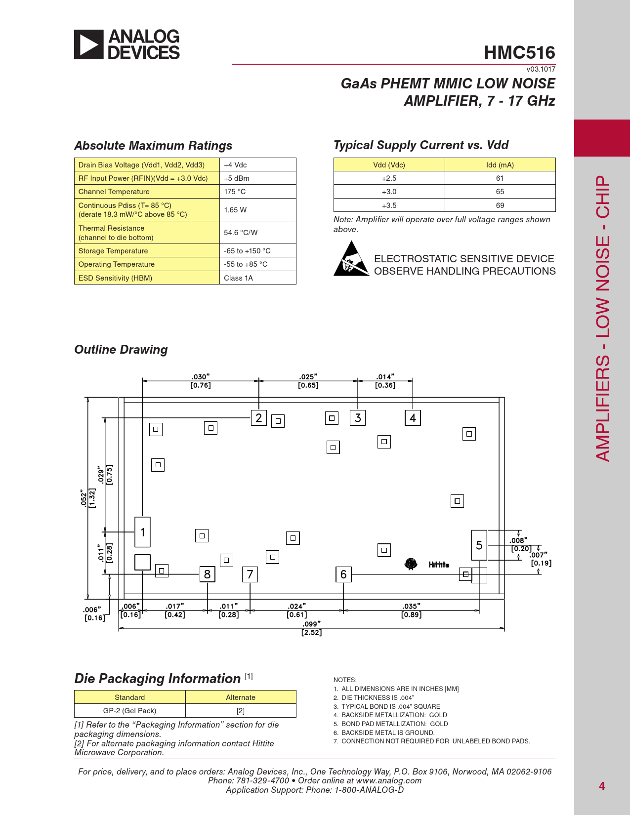 HMC516 v03.1017 GaAs PHEMT MMIC LOW NOISEAMPLIFIER, 7 - 17 GHzAbsolute Maximum RatingsTypical Supply Current vs. Vdd Drain Bias Voltage (Vdd1, Vdd2, Vdd3) +4 Vdc Vdd (Vdc) Idd (mA) RF Input Power (RFIN)(Vdd = +3.0 Vdc) +5 dBm +2.5 61 Channel Temperature 175 °C +3.0 65 IP Continuous Pdiss (T= 85 °C) +3.5 69 H 1.65 W (derate 18.3 mW/°C above 85 °C) Note: Amplifier will operate over full voltage ranges shown Thermal Resistance 54.6 °C/W above. (channel to die bottom) E - C Storage Temperature -65 to +150 °C ELECTROSTATIC SENSITIVE DEVICE Operating Temperature -55 to +85 °C IS OBSERVE HANDLING PRECAUTIONS ESD Sensitivity (HBM) Class 1A O W N O Outline Drawing S - L R IE LIF P M A Die Packaging Information [1] NOTES: 1. ALL DIMENSIONS ARE IN INCHES [MM] Standard Alternate 2. DIE THICKNESS IS .004” 3. TYPICAL BOND IS .004” SQUARE GP-2 (Gel Pack) [2] 4. BACKSIDE METALLIZATION: GOLD 5. BOND PAD METALLIZATION: GOLD [1] Refer to the “Packaging Information” section for die 6. BACKSIDE METAL IS GROUND. packaging dimensions. 7. CONNECTION NOT REQUIRED FOR UNLABELED BOND PADS. [2] For alternate packaging information contact Hittite Microwave Corporation. For price, delivery, and to place orders: Analog Devices, Inc., One Technology Way, P.O. Box 9106, Norwood, MA 02062-9106 Phone: 781-329-4700 • Order online at www.analog.com Application Support: Phone: 1-800-ANALOG-D 4