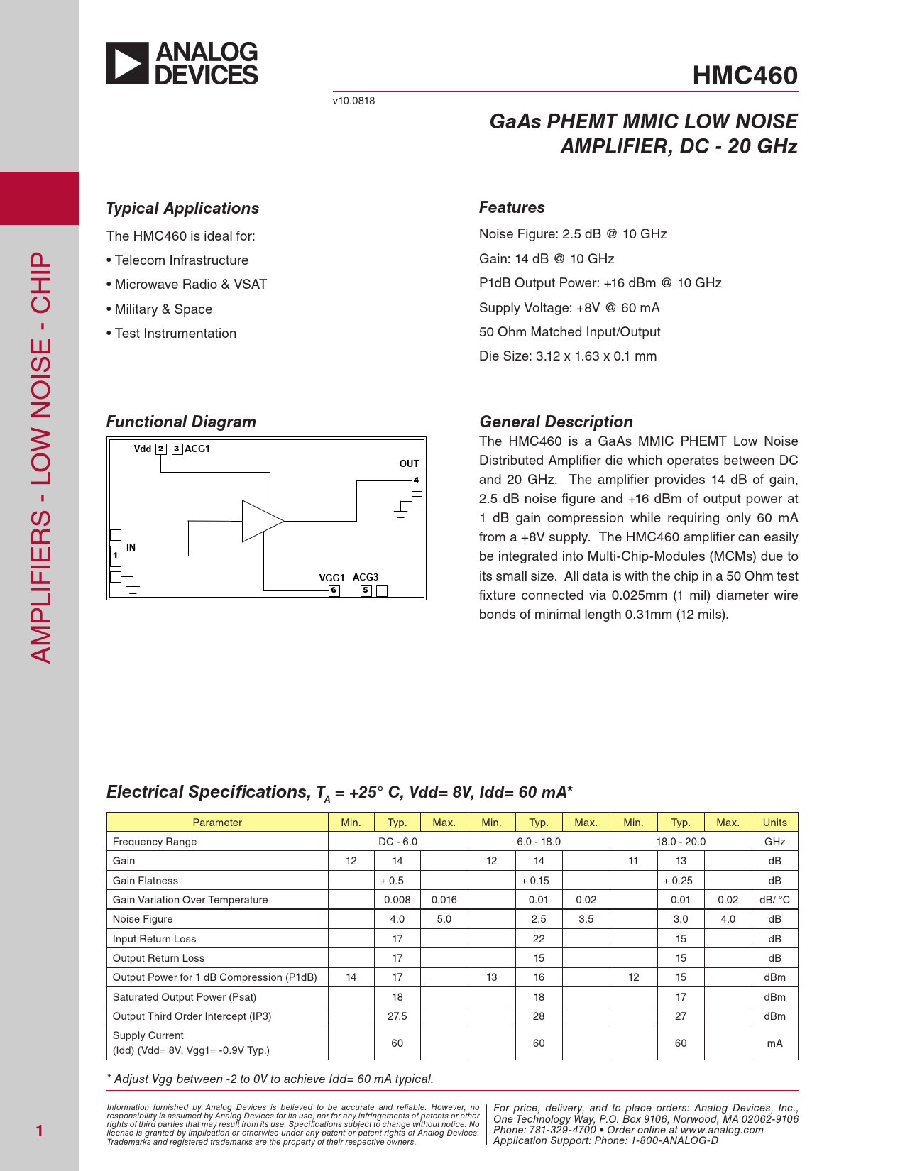 HMC460. GaAs PHEMT MMIC LOW NOISE. AMPLIFIER, DC - 20 GHz. Typical Applications. Features. Functional Diagram. General Description