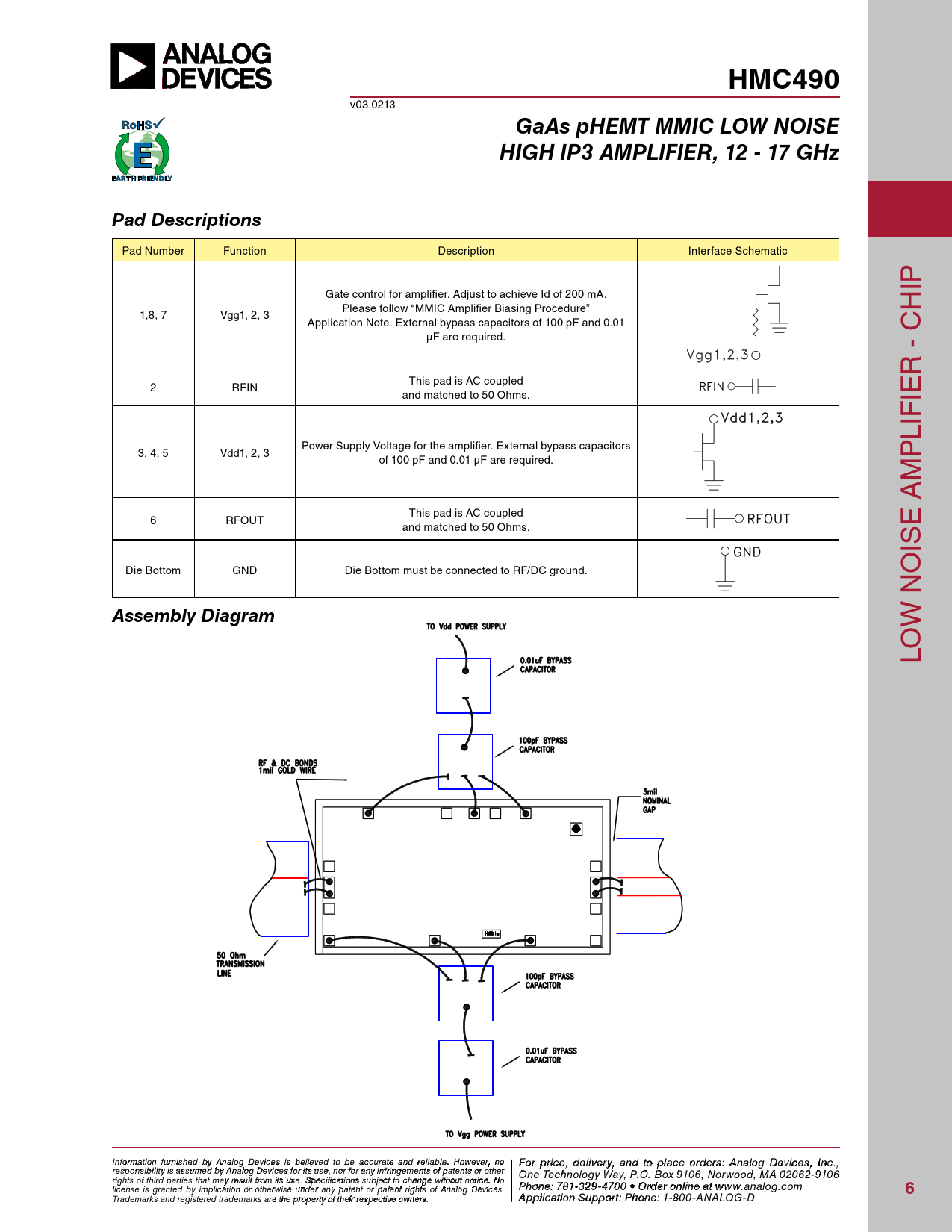 HMC490 v03.0213 GaAs pHEMT MMIC LOW NOISEHIGH IP3 AMPLIFIER, 12 - 17 GHzPad Descriptions Pad Number Function Description Interface Schematic IP Gate control for amplifier. Adjust to achieve Id of 200 mA. Please follow “MMIC Amplifier Biasing Procedure” H 1,8, 7 Vgg1, 2, 3 Application Note. External bypass capacitors of 100 pF and 0.01 µF are required. C - R This pad is AC coupled 2 RFIN and matched to 50 Ohms. IE LIF Power Supply Voltage for the amplifier. External bypass capacitors 3, 4, 5 Vdd1, 2, 3 of 100 pF and 0.01 µF are required. P M A This pad is AC coupled 6 RFOUT and matched to 50 Ohms. E IS Die Bottom GND Die Bottom must be connected to RF/DC ground. O N Assembly Diagram W LO Inf F or o m r p atio r n ifc ur e n , d ishe e d lbiv y e A r n y a alog n D d t evic o p es is la beclie o eved rd to ebre sa: H ccur iattti e tae M nd re ilicarbloew . H a o ve C wever, o n rp o For price, delivery, and to place orders: Analog Devices, Inc., responsibility is assumed by Analog Devices for its use, nor for any infringements of patents or other oration, 2 Elizabeth Drive, Chelmsford, MA 01824 One Technology Way, P.O. Box 9106, Norwood, MA 02062-9106 Phone: 978-250-3343 Fax: 978-250-3373 O rights of third parties that may result from its use. Specifications subject to change without notice. No P rd hone e r O : 7 n 81- -3li 2n 9 e a -47 t w 0 w 0 • O w rd .h e it r o t niltie n .c e ao t m license is granted by implication or otherwise under any patent or patent rights of Analog Devices. www.analog.com 6 Application Support: Pho Trademarks and registered trademarks are the property of their respective owners. ne: 978-250-33 A 4 p 3 p o lica rti a o p n S p u s p @ po h rt itt : P ite ho . n c e om : 1-800-ANALOG-D