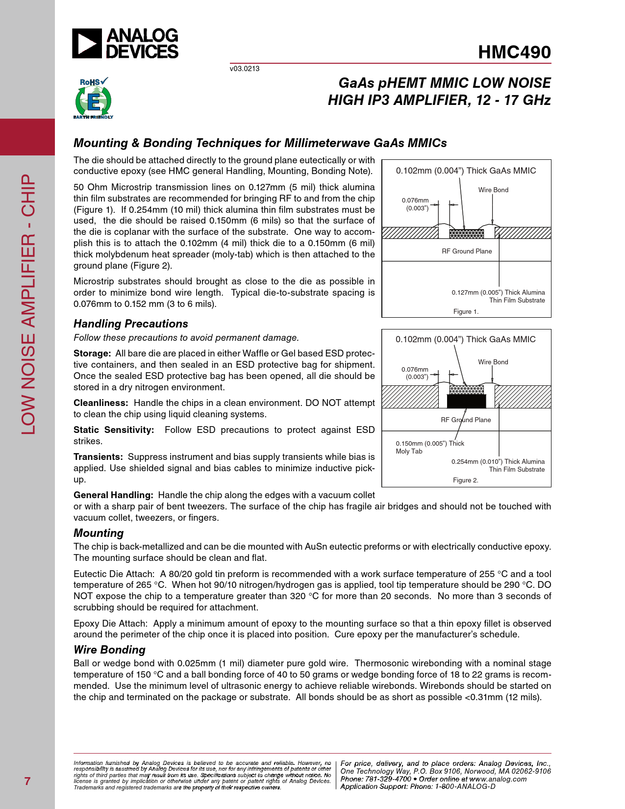 HMC490 v03.0213 GaAs pHEMT MMIC LOW NOISEHIGH IP3 AMPLIFIER, 12 - 17 GHzMounting & Bonding Techniques for Millimeterwave GaAs MMICs The die should be attached directly to the ground plane eutectical y or with conductive epoxy (see HMC general Handling, Mounting, Bonding Note). 0.102mm (0.004”) Thick GaAs MMIC IP H 50 Ohm Microstrip transmission lines on 0.127mm (5 mil) thick alumina Wire Bond thin film substrates are recommended for bringing RF to and from the chip 0.076mm C (Figure 1). If 0.254mm (10 mil) thick alumina thin film substrates must be (0.003”) - used, the die should be raised 0.150mm (6 mils) so that the surface of R the die is coplanar with the surface of the substrate. One way to accom- plish this is to attach the 0.102mm (4 mil) thick die to a 0.150mm (6 mil) IE thick molybdenum heat spreader (moly-tab) which is then attached to the RF Ground Plane ground plane (Figure 2). LIF Microstrip substrates should brought as close to the die as possible in P order to minimize bond wire length. Typical die-to-substrate spacing is 0.127mm (0.005”) Thick Alumina M 0.076mm to 0.152 mm (3 to 6 mils). Thin Film Substrate Figure 1. A Handling Precautions E Follow these precautions to avoid permanent damage. 0.102mm (0.004”) Thick GaAs MMIC IS Storage: All bare die are placed in either Waffle or Gel based ESD protec- O tive containers, and then sealed in an ESD protective bag for shipment. Wire Bond 0.076mm Once the sealed ESD protective bag has been opened, all die should be (0.003”) N stored in a dry nitrogen environment. W Cleanliness: Handle the chips in a clean environment. DO NOT attempt to clean the chip using liquid cleaning systems. LO RF Ground Plane Static Sensitivity: Fol ow ESD precautions to protect against ESD strikes. 0.150mm (0.005”) Thick Transients: Moly Tab Suppress instrument and bias supply transients while bias is 0.254mm (0.010”) Thick Alumina applied. Use shielded signal and bias cables to minimize inductive pick- Thin Film Substrate up. Figure 2. General Handling: Handle the chip along the edges with a vacuum col et or with a sharp pair of bent tweezers. The surface of the chip has fragile air bridges and should not be touched with vacuum col et, tweezers, or fingers. Mounting The chip is back-metal ized and can be die mounted with AuSn eutectic preforms or with electrical y conductive epoxy. The mounting surface should be clean and flat. Eutectic Die Attach: A 80/20 gold tin preform is recommended with a work surface temperature of 255 °C and a tool temperature of 265 °C. When hot 90/10 nitrogen/hydrogen gas is applied, tool tip temperature should be 290 °C. DO NOT expose the chip to a temperature greater than 320 °C for more than 20 seconds. No more than 3 seconds of scrubbing should be required for attachment. Epoxy Die Attach: Apply a minimum amount of epoxy to the mounting surface so that a thin epoxy fil et is observed around the perimeter of the chip once it is placed into position. Cure epoxy per the manufacturer’s schedule. Wire Bonding Ball or wedge bond with 0.025mm (1 mil) diameter pure gold wire. Thermosonic wirebonding with a nominal stage temperature of 150 °C and a ball bonding force of 40 to 50 grams or wedge bonding force of 18 to 22 grams is recom- mended. Use the minimum level of ultrasonic energy to achieve reliable wirebonds. Wirebonds should be started on the chip and terminated on the package or substrate. All bonds should be as short as possible <0.31mm (12 mils). Inf F or o m r p atio r n ifc ur e n , d ishe e d lbiv y e A r n y a alog n D d t evic o p es is la beclie o eved rd to ebre sa: H ccur iattti e tae M nd re ilicarbloew . H a o ve C wever, o n rp o For price, delivery, and to place orders: Analog Devices, Inc., responsibility is assumed by Analog Devices for its use, nor for any infringements of patents or other oration, 2 Elizabeth Drive, Chelmsford, MA 01824 One Technology Way, P.O. Box 9106, Norwood, MA 02062-9106 Phone: 978-250-3343 Fax: 978-250-3373 O rights of third parties that may result from its use. Specifications subject to change without notice. No P rd hone e r O : 7 n 81- -3li 2n 9 e a -47 t w 0 w 0 • O w rd .h e it r o t niltie n .c e ao t m 7 license is granted by implication or otherwise under any patent or patent rights of Analog Devices. www.analog.com Application Support: Pho Trademarks and registered trademarks are the property of their respective owners. ne: 978-250-33 A 4 p 3 p o lica rti a o p n S p u s p @ po h rt itt : P ite ho . n c e om : 1-800-ANALOG-D