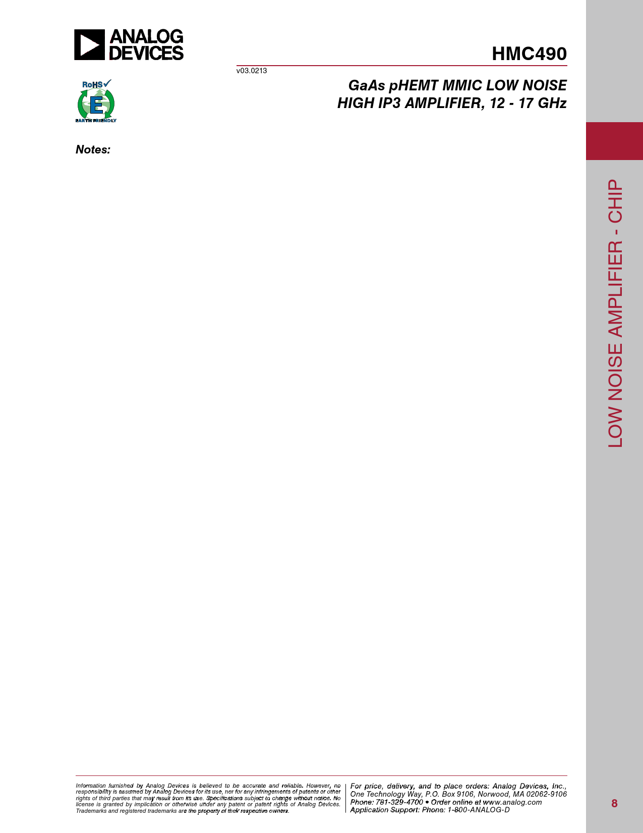 Pages / Page8 / 8 — HMC490. GaAs pHEMT MMIC LOW NOISE. HIGH IP3 AMPLIFIER, 12 - 17 GHz. Notes:
