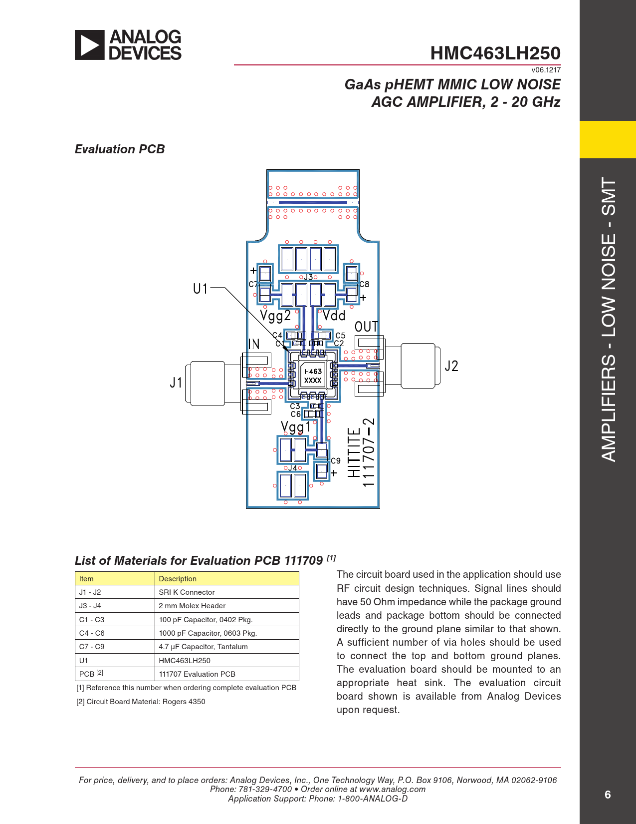 HMC463LH250. GaAs pHEMT MMIC LOW NOISE. AGC AMPLIFIER, 2 - 20 GHz. Evaluation PCB