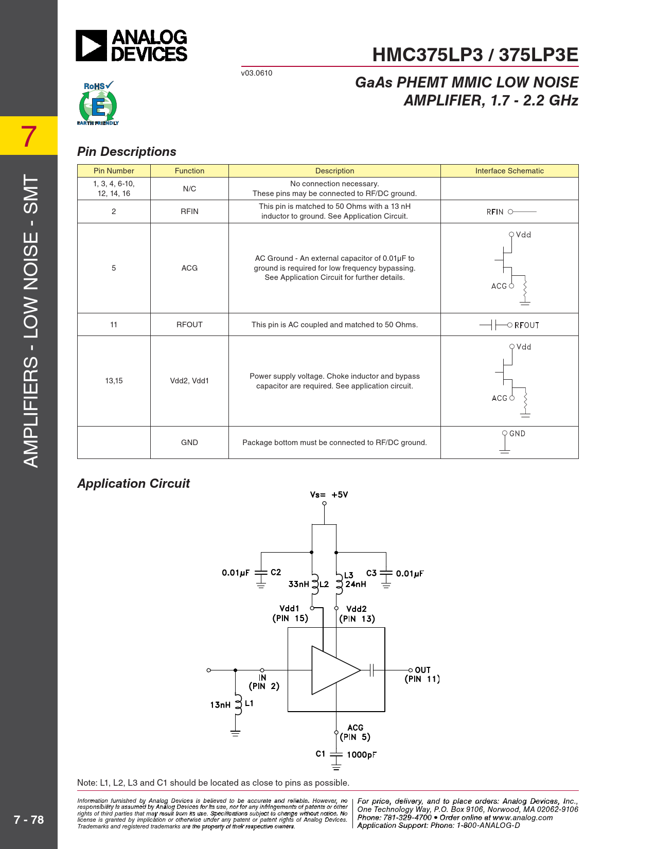 HMC375LP3 / 375LP3E. GaAs PHEMT MMIC LOW NOISE. AMPLIFIER, 1.7 - 2.2 GHz. Pin Descriptions. Application Circuit. 7 - 78