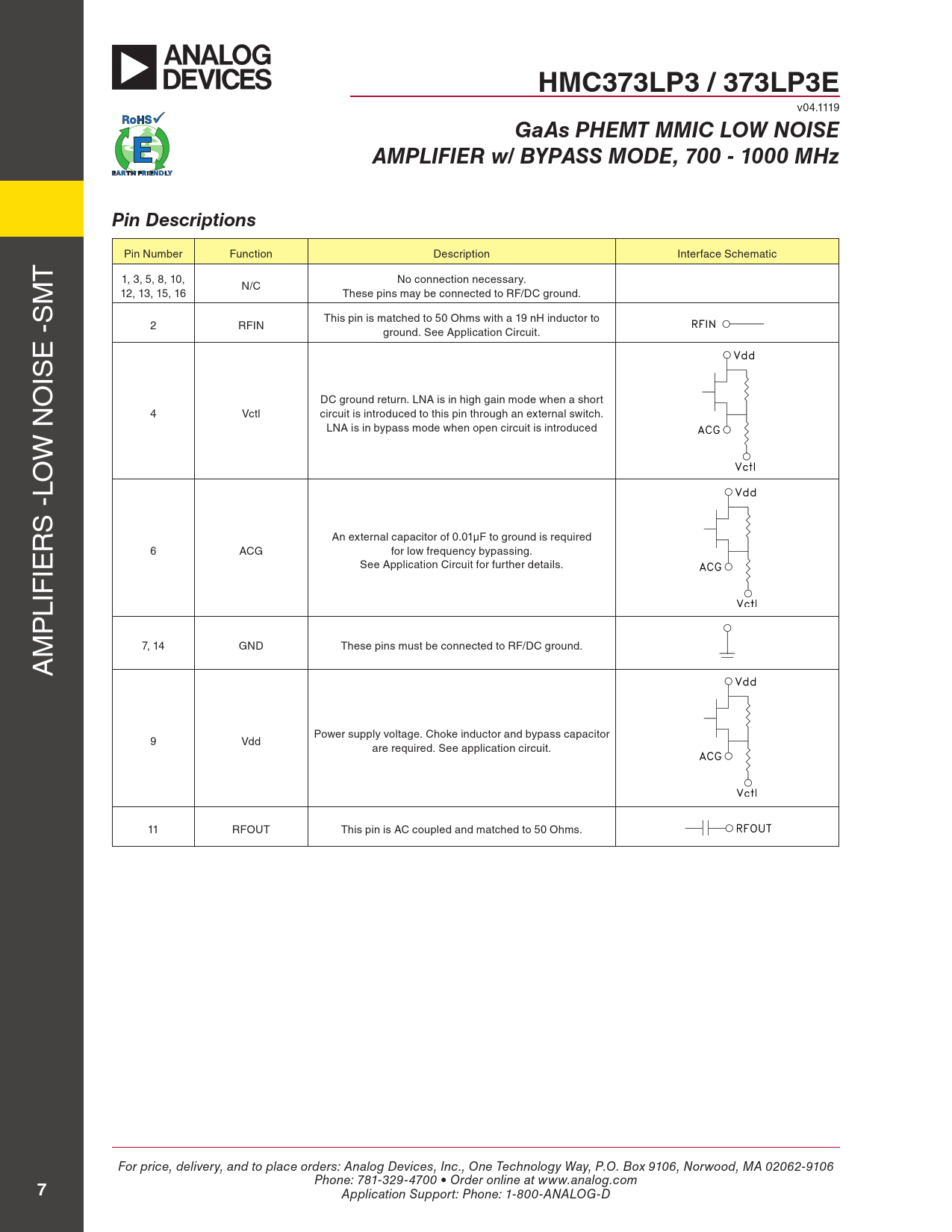 HMC373LP3 / 373LP3E v04.1119 GaAs PHEMT MMIC LOW NOISEAMPLIFIER w/ BYPASS MODE, 700 - 1000 MHzPin Descriptions Pin Number Function Description Interface Schematic T M 1, 3, 5, 8, 10, No connection necessary. N/C 12, 13, 15, 16 These pins may be connected to RF/DC ground. S - This pin is matched to 50 Ohms with a 19 nH inductor to 2 RFIN ground. See Application Circuit. E IS O DC ground return. LNA is in high gain mode when a short N 4 Vctl circuit is introduced to this pin through an external switch. LNA is in bypass mode when open circuit is introduced W LO - S R An external capacitor of 0.01µF to ground is required 6 ACG for low frequency bypassing. IE See Application Circuit for further details. LIF P M 7, 14 GND These pins must be connected to RF/DC ground. A Power supply voltage. Choke inductor and bypass capacitor 9 Vdd are required. See application circuit. 11 RFOUT This pin is AC coupled and matched to 50 Ohms. For price, delivery, and to place orders: Analog Devices, Inc., One Technology Way, P.O. Box 9106, Norwood, MA 02062-9106 Phone: 781-329-4700 • Order online at www.analog.com 7 Application Support: Phone: 1-800-ANALOG-D
