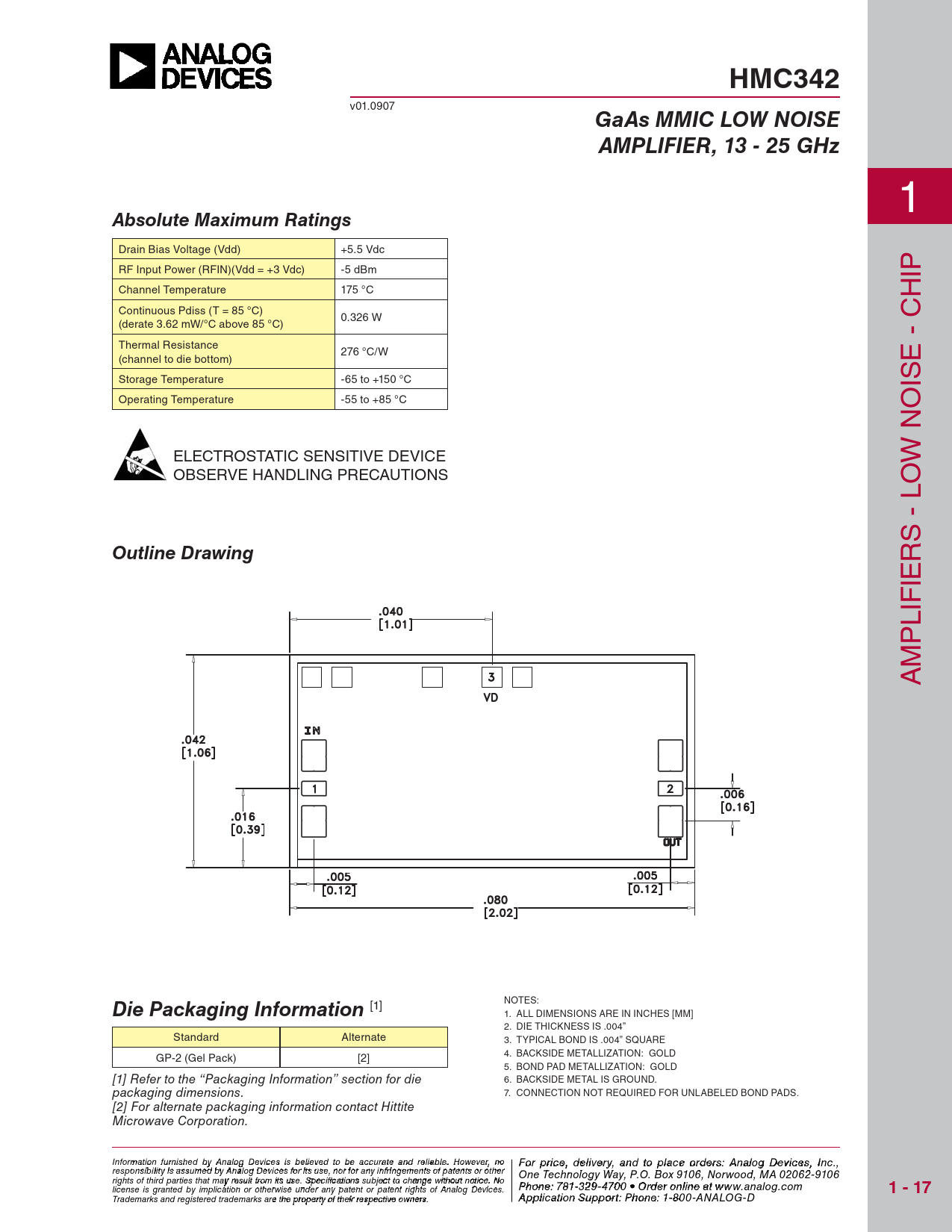 HMC342 GaAs MMIC LOW NOISE AMPLIFIER, 13 - 25 GHz Absolute Maximum Ratings Outline Drawing Die Packaging Information 1 - 17