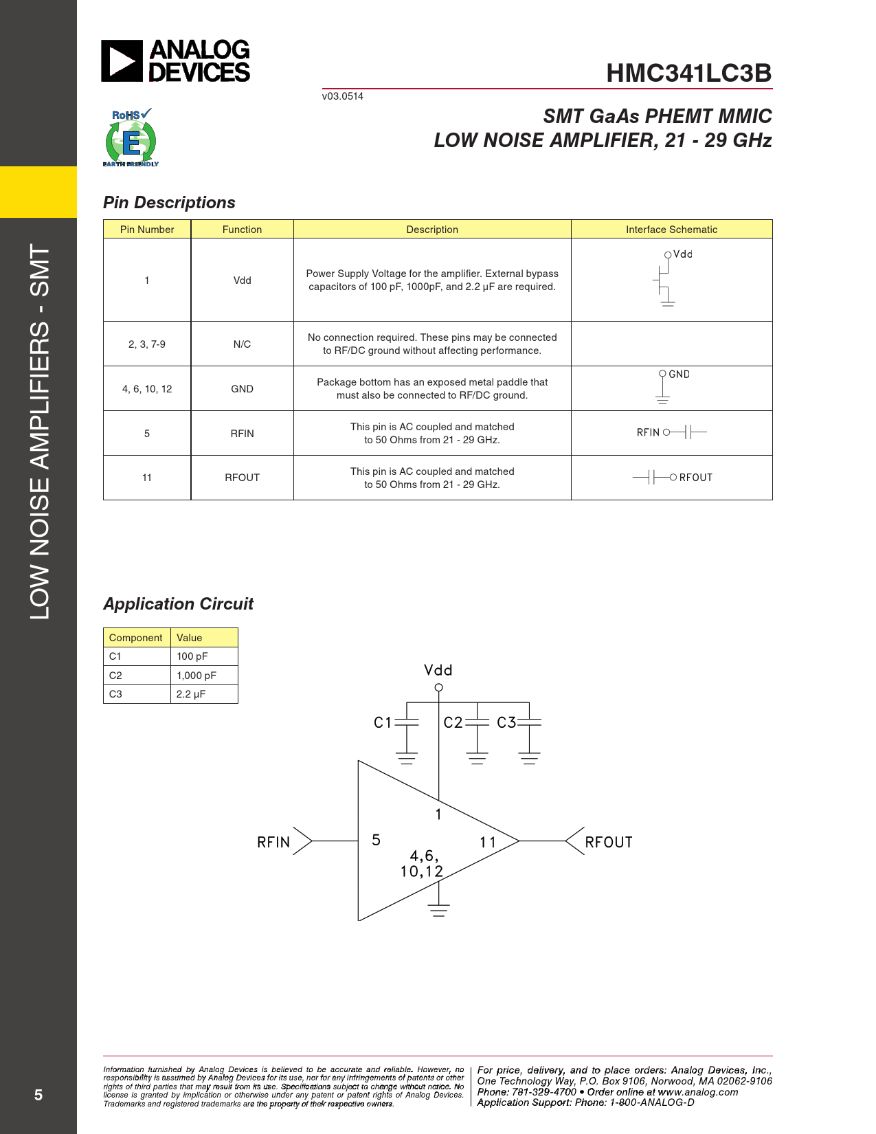 HMC341LC3B v03.0514 SMT GaAs PHEMT MMICLOW NOISE AMPLIFIER, 21 - 29 GHzPin Descriptions Pin Number Function Description Interface Schematic T M Power Supply Voltage for the amplifier. External bypass 1 Vdd capacitors of 100 pF, 1000pF, and 2.2 µF are required. S - S R No connection required. These pins may be connected 2, 3, 7-9 N/C to RF/DC ground without affecting performance. IE Package bottom has an exposed metal paddle that 4, 6, 10, 12 GND LIF must also be connected to RF/DC ground. P This pin is AC coupled and matched M 5 RFIN to 50 Ohms from 21 - 29 GHz. E A This pin is AC coupled and matched 11 RFOUT to 50 Ohms from 21 - 29 GHz. IS O W N LO Application Circuit Component Value C1 100 pF C2 1,000 pF C3 2.2 µF Inf F or o m r p atio r n ifc ur e n , d ishe e d lbiv y e A r n y a alog n D d t evic o p es is la beclie o eved rd to ebre sa: H ccur iattti e tae M nd re ilicarbloew . H a o ve C wever, o n rp o For price, delivery, and to place orders: Analog Devices, Inc., responsibility is assumed by Analog Devices for its use, nor for any infringements of patents or other oration, 2 Elizabeth Drive, Chelmsford, MA 01824 One Technology Way, P.O. Box 9106, Norwood, MA 02062-9106 Phone: 978-250-3343 Fax: 978-250-3373 O rights of third parties that may result from its use. Specifications subject to change without notice. No P rd hone e r O : 7 n 81- -3li 2n 9 e a -47 t w 0 w 0 • O w rd .h e it r o t niltie n .c e ao t m 5 license is granted by implication or otherwise under any patent or patent rights of Analog Devices. www.analog.com Application Support: Pho Trademarks and registered trademarks are the property of their respective owners. ne: 978-250-33 A 4 p 3 o plica r a tio p n S p u s p @ po h rt itt : P ite ho . n c e o : 1m -800-ANALOG-D