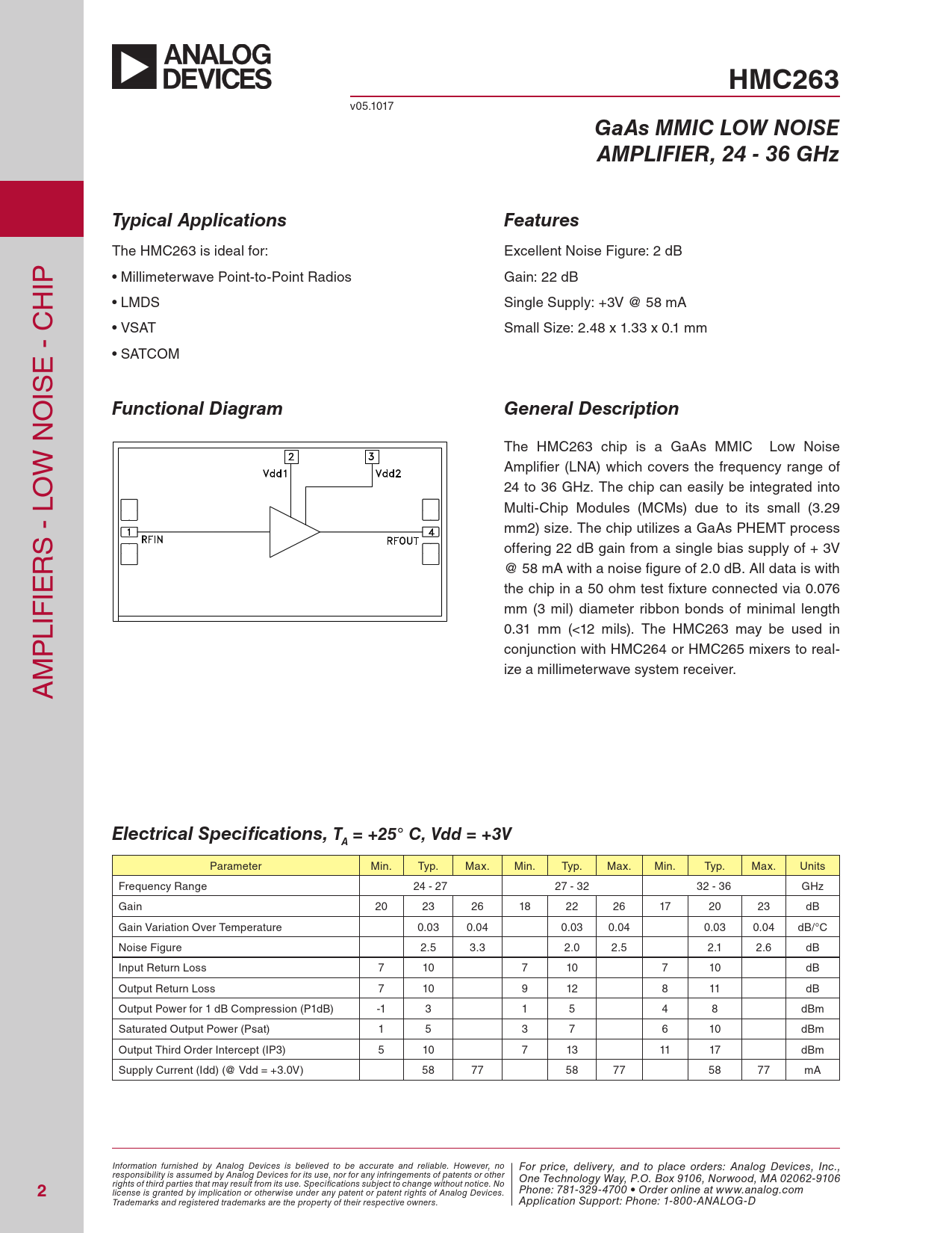HMC263. GaAs MMIC LOW NOISE. AMPLIFIER, 24 - 36 GHz. Typical Applications. Features. Functional Diagram. General Description