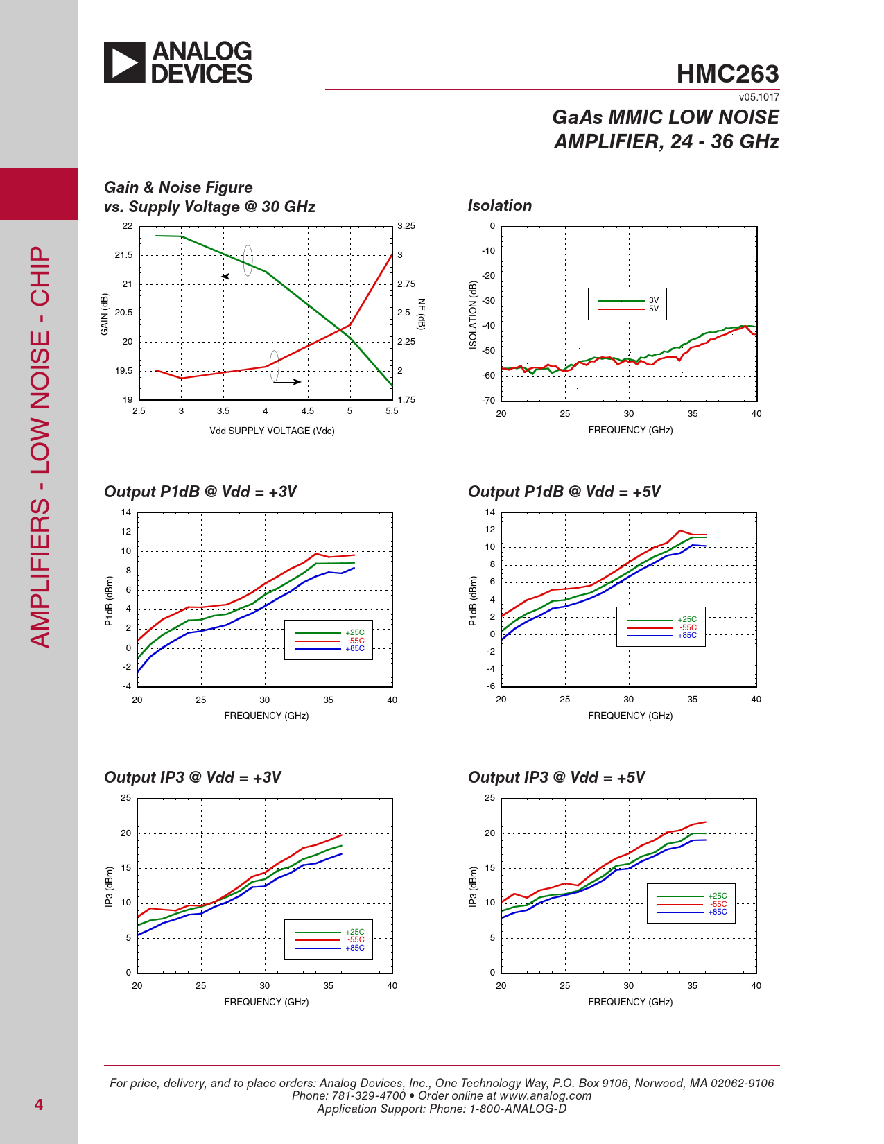 HMC263. GaAs MMIC LOW NOISE. AMPLIFIER, 24 - 36 GHz. Gain & Noise Figure vs. Supply Voltage @ 30 GHz. Isolation