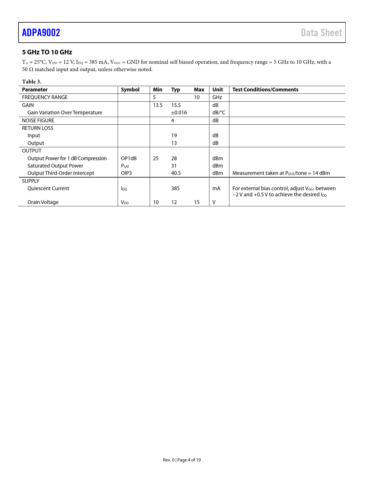 Pages / Page19 / 4 — ADPA9002. Data Sheet. 5 GHz TO 10 GHz. Table 3. Parameter. Symbol. Min. …