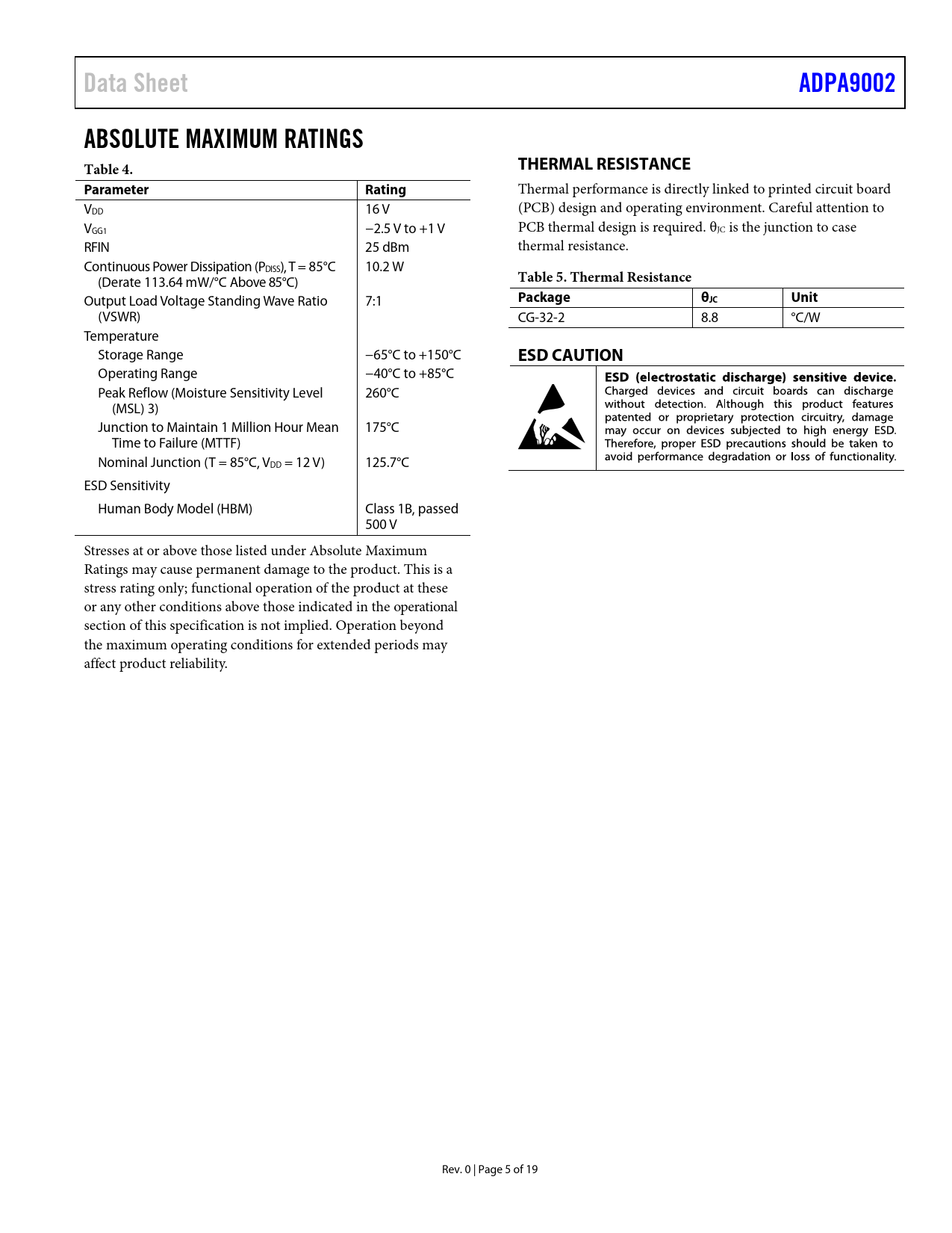 Pages / Page19 / 5 — Data Sheet. ADPA9002. ABSOLUTE MAXIMUM RATINGS Table 4. THERMAL …