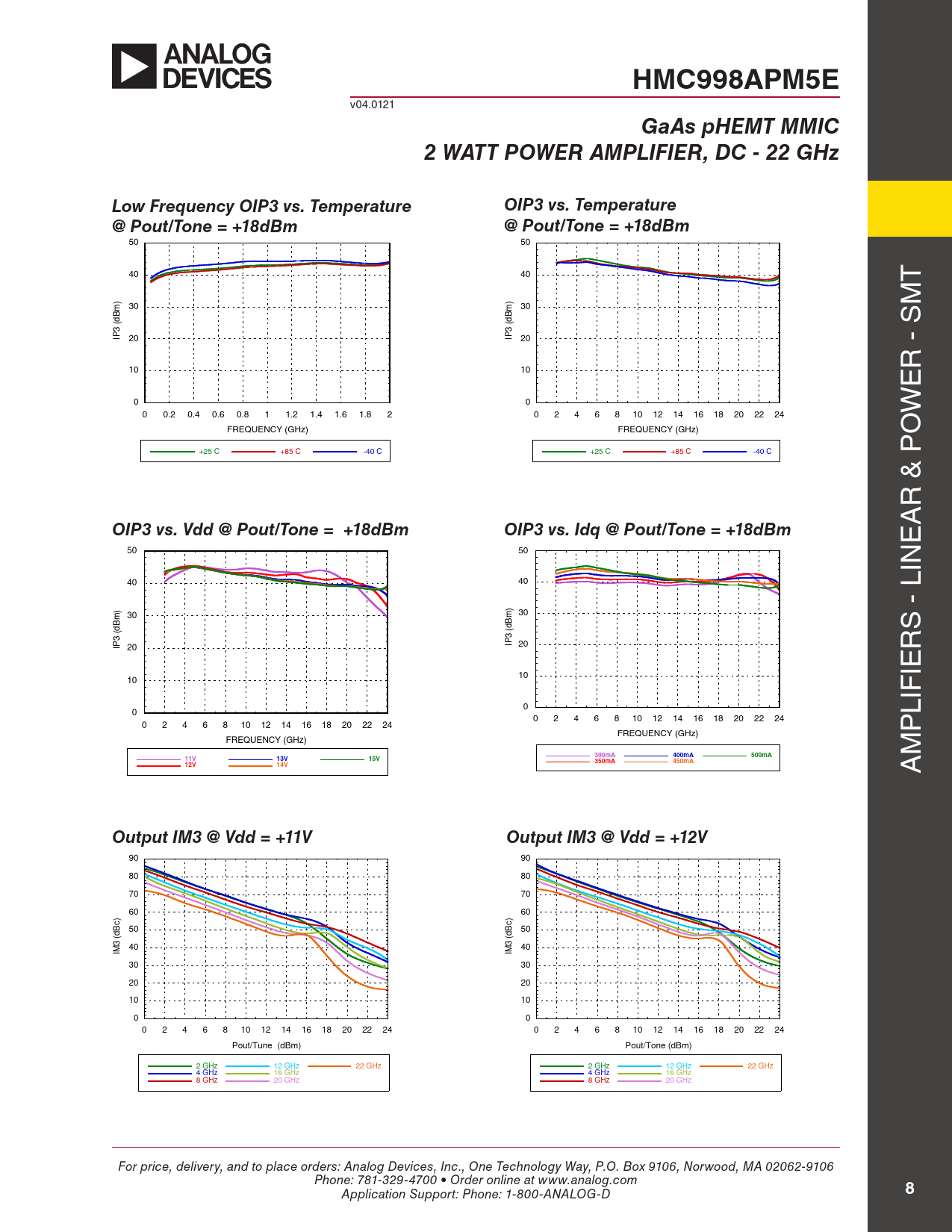 90 90 80 80 70 70 60 60 ) c c 50 50 (dB (dB 3 3 40 40 IM IM 30 30 20 20 10 10 0 0 0 2 4 6 8 10 12 14 16 18 20 22 24 0 2 4 6 8 10 12 14 16 18 20 22 24 Pout/Tune (dBm) Pout/Tone (dBm) 2 GHz 12 GHz 22 GHz 2 GHz 12 GHz 22 GHz 4 GHz 16 GHz 4 GHz 16 GHz 8 GHz 20 GHz 8 GHz 20 GHz For price, delivery, and to place orders: Analog Devices, Inc., One Technology Way, P.O. Box 9106, Norwood, MA 02062-9106 Phone: 781-329-4700 • Order online at www.analog.com