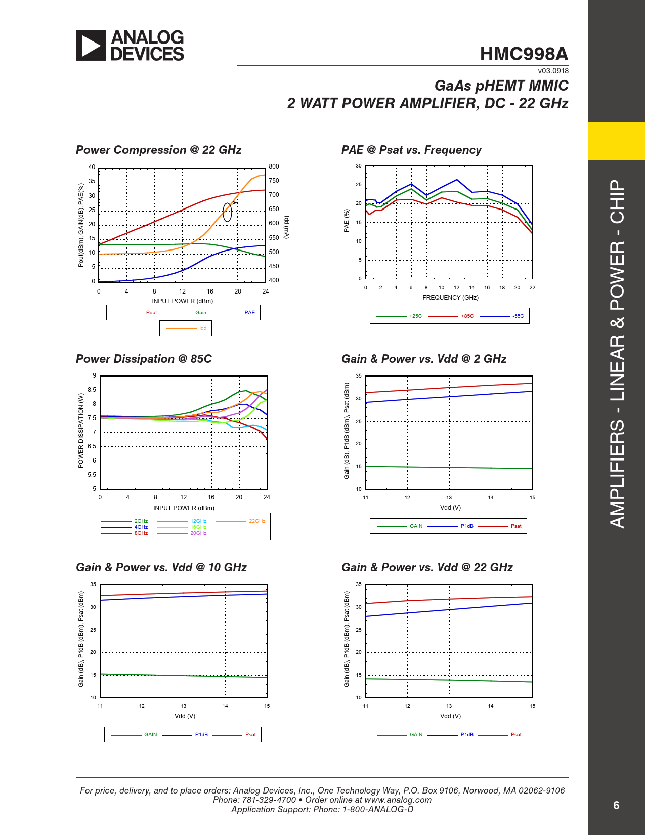HMC998A v03.0918 GaAs pHEMT MMIC2 WATT POWER AMPLIFIER, DC - 22 GHzPower Compression @ 22 GHzPAE @ Psat vs. Frequency 40 800 30 35 750 25 30 700 IP 20 25 650 H Idd (mA) 20 600 15 PAE (%) 15 550 10 10 500 R - C 5 Pout(dBm), GAIN(dB), PAE(%) 5 450 E 0 400 0 W 0 4 8 12 16 20 24 0 2 4 6 8 10 12 14 16 18 20 22 FREQUENCY (GHz) O INPUT POWER (dBm) Pout Gain PAE +25C +85C -55C Idd R & P Power Dissipation @ 85CGain & Power vs. Vdd @ 2 GHz A E 9 35 8.5 IN 30 8 7.5 25 7 S - L 6.5 20 R 6 IE POWER DISSIPATION (W) 15 5.5 Gain (dB), P1dB (dBm), Psat (dBm) 5 10 LIF 0 4 8 12 16 20 24 11 12 13 14 15 P INPUT POWER (dBm) Vdd (V) M 2GHz 12GHz 22GHz 4GHz 16GHz GAIN P1dB Psat A 8GHz 20GHz Gain & Power vs. Vdd @ 10 GHzGain & Power vs. Vdd @ 22 GHz 35 35 30 30 25 25 20 20 15 15 Gain (dB), P1dB (dBm), Psat (dBm) Gain (dB), P1dB (dBm), Psat (dBm) 10 10 11 12 13 14 15 11 12 13 14 15 Vdd (V) Vdd (V) GAIN P1dB Psat GAIN P1dB Psat For price, delivery, and to place orders: Analog Devices, Inc., One Technology Way, P.O. Box 9106, Norwood, MA 02062-9106 Phone: 781-329-4700 • Order online at www.analog.com Application Support: Phone: 1-800-ANALOG-D 6 Document Outline Typical Applications Features Functional Diagram General Description Electrical Specifications Performance Characteristics Gain & Return Loss Gain vs. Temperature Input Return Loss vs. Temperature Output Return Loss vs. Temperature Noise Figure vs. Temperature P1dB vs. Temperature Output IP3 vs. Temperature @ Pout = 16 dBm / Tone Reverse Isolation vs. Temperature Second Harmonics vs. Temperature @ Pout = 14 dBm, Vdd = 10V & Vgg = 3.5V, 175 mA Second Harmonics vs. Vdd @ Pout = 14 dBm, Idd = 175 mA Absolute Maximum Ratings Pad Descriptions Assembly Diagram Application Circuit Mounting & Bonding Techniques for Millimeterwave GaAs MMICs
