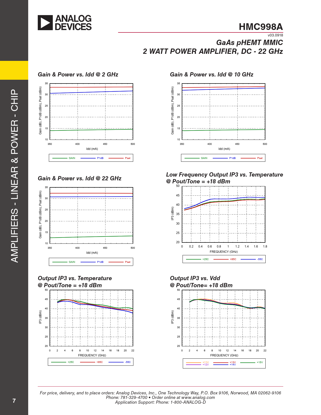 HMC998A v03.0918 GaAs pHEMT MMIC2 WATT POWER AMPLIFIER, DC - 22 GHzGain & Power vs. Idd @ 2 GHzGain & Power vs. Idd @ 10 GHz 35 35 IP 30 30 H 25 25 20 20 R - C E 15 15 W Gain (dB), P1dB (dBm), Psat (dBm) Gain (dB), P1dB (dBm), Psat (dBm) 10 10 O 350 400 450 500 350 400 450 500 Idd (mA) Idd (mA) GAIN P1dB Psat GAIN P1dB Psat R & P A Low Frequency Output IP3 vs. Temperature E Gain & Power vs. Idd @ 22 GHz@ Pout/Tone = +18 dBm 50 IN 35 45 30 40 S - L ) 25 R 35 20 IP3 (dBm IE 30 15 25 LIF Gain (dB), P1dB (dBm), Psat (dBm) P 10 20 350 400 450 500 0 0.2 0.4 0.6 0.8 1 1.2 1.4 1.6 1.8 M Idd (mA) FREQUENCY (GHz) A +25C +85C -55C GAIN P1dB Psat Output IP3 vs. TemperatureOutput IP3 vs. Vdd@ Pout/Tone = +18 dBm@ Pout/Tone= +18 dBm 50 50 45 45 40 ) 40 ) 35 35 IP3 (dBm IP3 (dBm 30 30 25 25 20 20 0 2 4 6 8 10 12 14 16 18 20 22 0 2 4 6 8 10 12 14 16 18 20 22 FREQUENCY (GHz) FREQUENCY (GHz) +25C +85C -55C +11V +13V +15V +12V +14V For price, delivery, and to place orders: Analog Devices, Inc., One Technology Way, P.O. Box 9106, Norwood, MA 02062-9106 Phone: 781-329-4700 • Order online at www.analog.com 7 Application Support: Phone: 1-800-ANALOG-D Document Outline Typical Applications Features Functional Diagram General Description Electrical Specifications Performance Characteristics Gain & Return Loss Gain vs. Temperature Input Return Loss vs. Temperature Output Return Loss vs. Temperature Noise Figure vs. Temperature P1dB vs. Temperature Output IP3 vs. Temperature @ Pout = 16 dBm / Tone Reverse Isolation vs. Temperature Second Harmonics vs. Temperature @ Pout = 14 dBm, Vdd = 10V & Vgg = 3.5V, 175 mA Second Harmonics vs. Vdd @ Pout = 14 dBm, Idd = 175 mA Absolute Maximum Ratings Pad Descriptions Assembly Diagram Application Circuit Mounting & Bonding Techniques for Millimeterwave GaAs MMICs