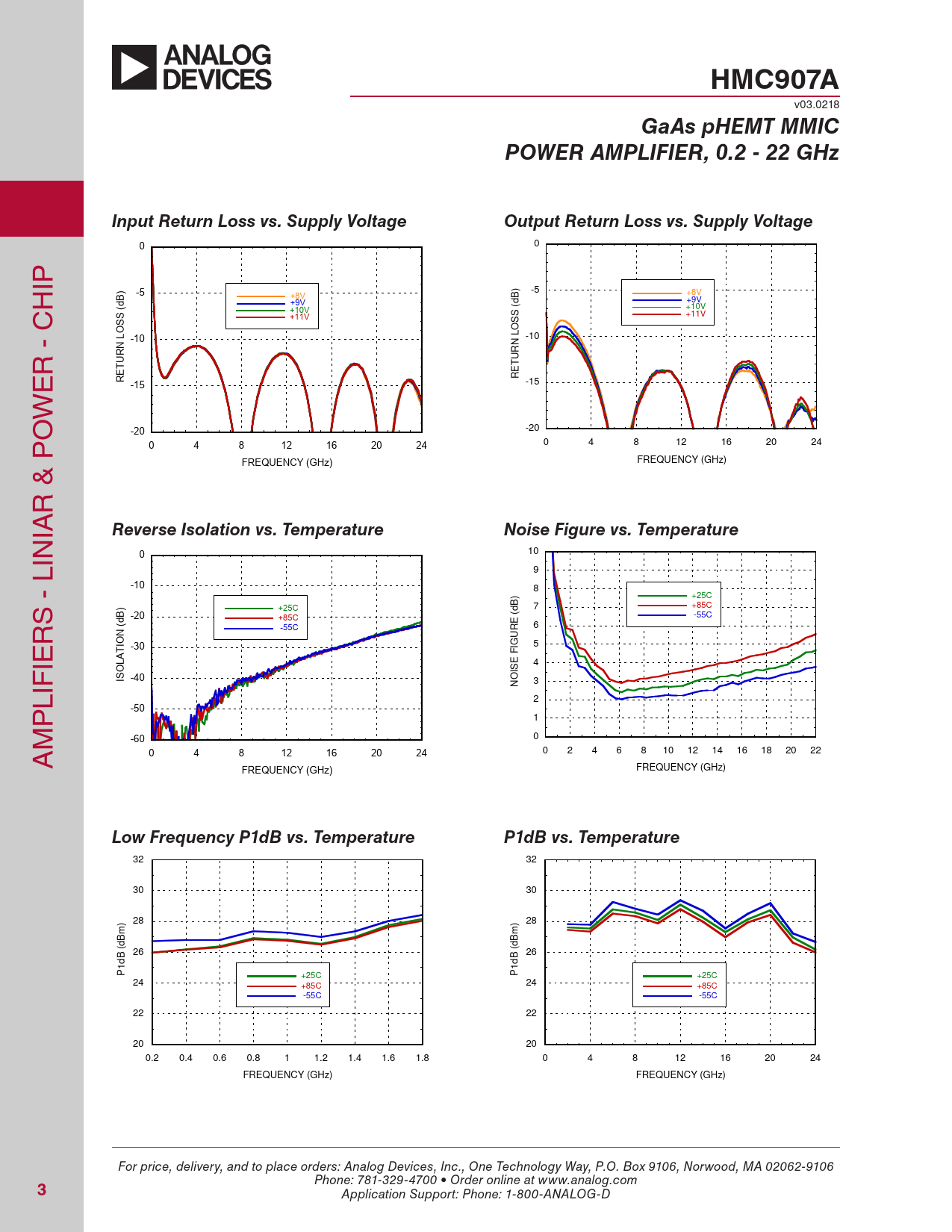 32 32 30 30 28 ) 28 ) m m (dB 26 (dB 26 1dB 1dB P +25C P +25C 24 +85C 24 +85C -55C -55C 22 22 20 20 0.2 0.4 0.6 0.8 1 1.2 1.4 1.6 1.8 0 4 8 12 16 20 24 FREQUENCY (GHz) FREQUENCY (GHz) For price, delivery, and to place orders: Analog Devices, Inc., One Technology Way, P.O. Box 9106, Norwood, MA 02062-9106 Phone: 781-329-4700 • Order online at www.analog.com