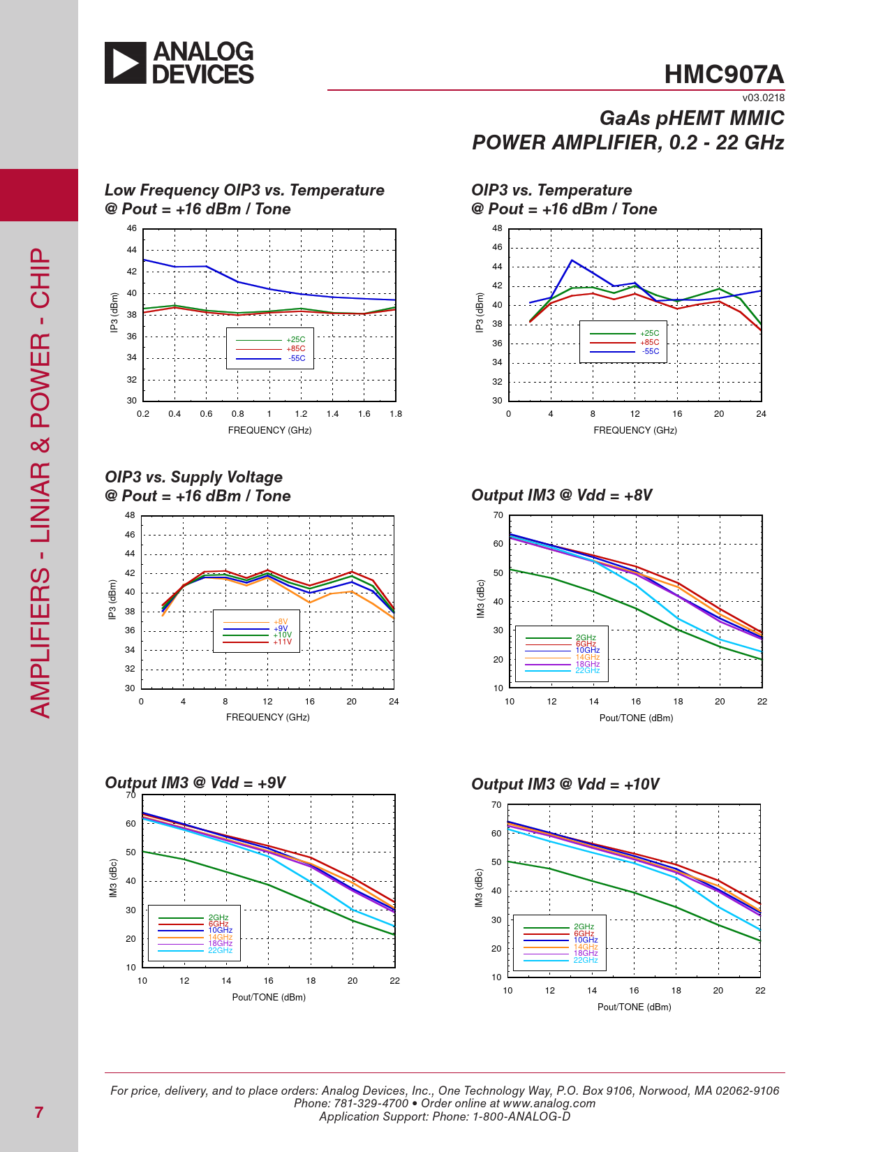 70 70 60 60 50 ) c 50 ) c (dB 40 3 (dB IM 40 3 IM 30 2GHz 30 6GHz 10GHz 2GHz 6GHz 20 14GHz 10GHz 18GHz 22GHz 20 14GHz 18GHz 22GHz 10 10 12 14 16 18 20 22 10 10 12 14 16 18 20 22 Pout/TONE (dBm) Pout/TONE (dBm) For price, delivery, and to place orders: Analog Devices, Inc., One Technology Way, P.O. Box 9106, Norwood, MA 02062-9106 Phone: 781-329-4700 • Order online at www.analog.com