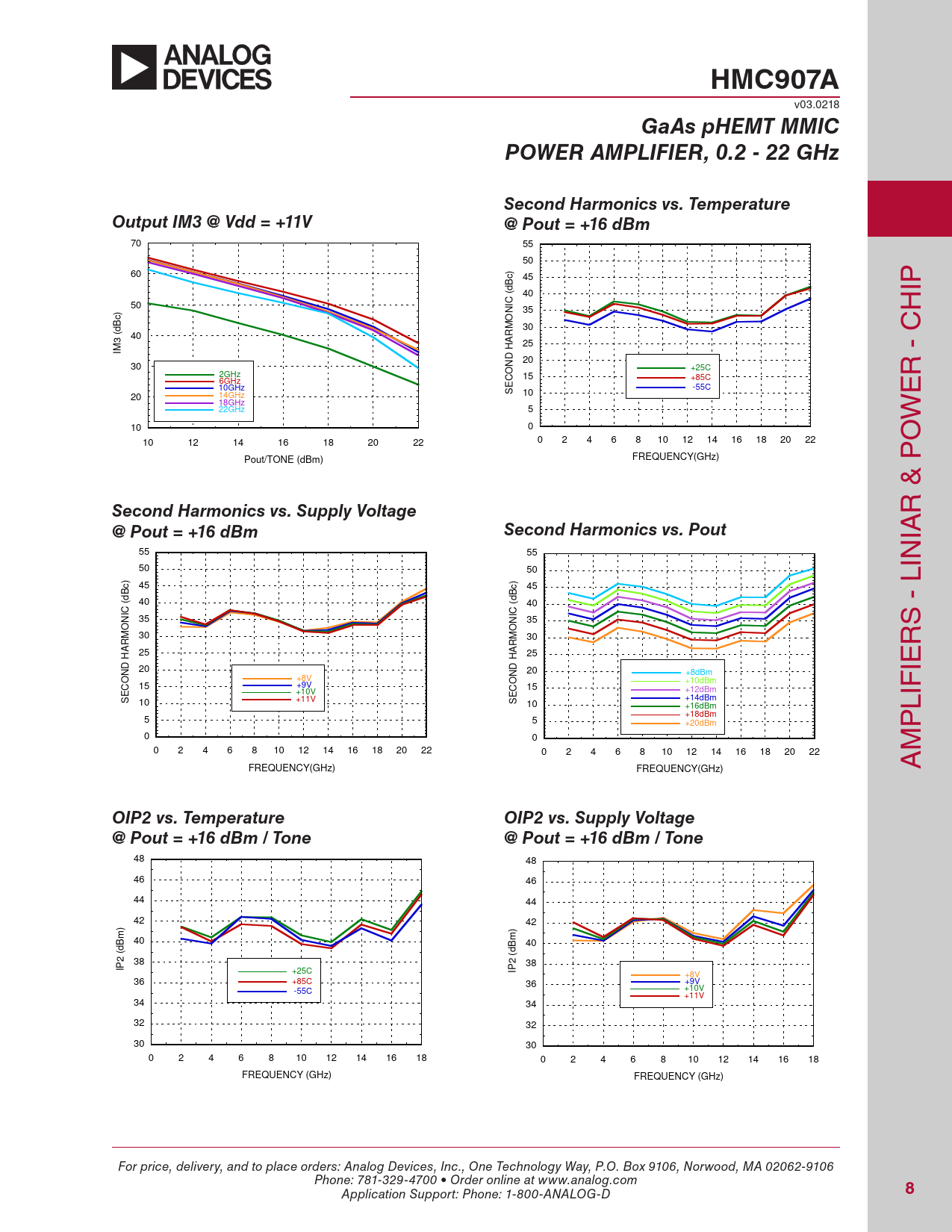 HMC907A v03.0218 GaAs pHEMT MMICPOWER AMPLIFIER, 0.2 - 22 GHzSecond Harmonics vs. TemperatureOutput IM3 @ Vdd = +11V@ Pout = +16 dBm 70 55 50 ) 60 c 45 B (d 40 IP C 50 ) NI 35 H c O 30 (dB RM 40 3 25 IM HA 20 ND 30 +25C O 2GHz C 15 +85C R - C 6GHz E 10GHz -55C S 10 14GHz E 20 18GHz 22GHz 5 W 0 10 0 2 4 6 8 10 12 14 16 18 20 22 10 12 14 16 18 20 22 O FREQUENCY(GHz) Pout/TONE (dBm) Second Harmonics vs. Supply Voltage R & P @ Pout = +16 dBmSecond Harmonics vs. Pout IA 55 55 50 50 IN ) c 45 ) c 45 B B (d 40 (d 40 C C NI 35 NI 35 O O S - L 30 30 RM RM R 25 25 HA HA 20 ND 20 ND +8dBm IE +8V O O +10dBm C 15 +9V C 15 +10V +12dBm E E +14dBm 10 +11V S S 10 +16dBm LIF +18dBm 5 5 +20dBm P 0 0 0 2 4 6 8 10 12 14 16 18 20 22 0 2 4 6 8 10 12 14 16 18 20 22 M FREQUENCY(GHz) FREQUENCY(GHz) A OIP2 vs. TemperatureOIP2 vs. Supply Voltage@ Pout = +16 dBm / Tone@ Pout = +16 dBm / Tone 48 48 46 46 44 44 42 42 ) m 40 m 40 (dB (dB 2 38 2 IP 38 +25C IP +8V 36 +85C 36 +9V -55C +10V +11V 34 34 32 32 30 30 0 2 4 6 8 10 12 14 16 18 0 2 4 6 8 10 12 14 16 18 FREQUENCY (GHz) FREQUENCY (GHz) For price, delivery, and to place orders: Analog Devices, Inc., One Technology Way, P.O. Box 9106, Norwood, MA 02062-9106 Phone: 781-329-4700 • Order online at www.analog.com Application Support: Phone: 1-800-ANALOG-D 8 Document Outline Typical Applications Features Functional Diagram General Description Electrical Specifications Typical Performance Characteristics Gain & Return Loss Gain vs. Temperature Input Return Loss vs. Temperature Output Return Loss vs. Temperature Reverse Isolation vs. Temperature Noise Figure vs. Frequency Gain, Power & Output IP3 vs. Supply Voltage @ 12 GHz Power Compression @ 2 GHz Power Dissipation Absolute Maximum Ratings Outline Drawing Die Packaging Information Pad Descriptions Assembly Diagram Application Circuit Mounting & Bonding Techniques for Millimeterwave GaAs MMICs