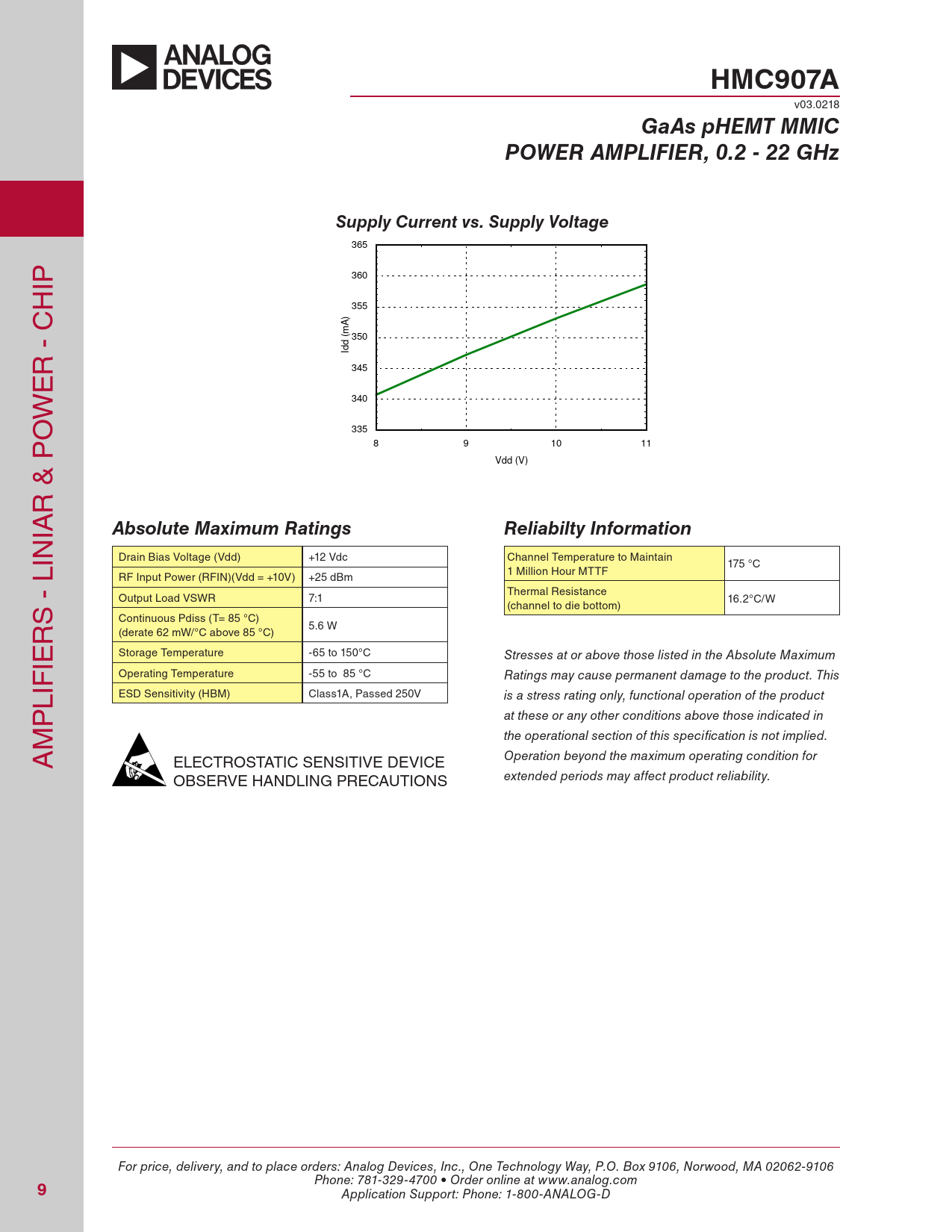 HMC907A. GaAs pHEMT MMIC. POWER AMPLIFIER, 0.2 - 22 GHz. Supply Current vs. Supply Voltage. Absolute Maximum Ratings