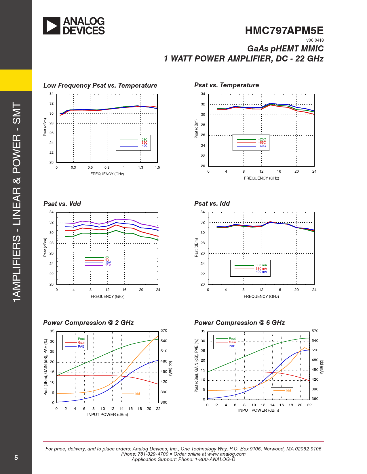 HMC797APM5E v06.0418 GaAs pHEMT MMIC1 WATT POWER AMPLIFIER, DC - 22 GHzLow Frequency Psat vs. TemperaturePsat vs. Temperature 34 34 T 32 32 M 30 30 ) m 28 m 28 (dB (dB at R - S s 26 at P s 26 P E +25C +25C 24 +85C +85C -40C 24 -40C W 22 22 O 20 20 0 0.3 0.5 0.8 1 1.3 1.5 0 4 8 12 16 20 24 FREQUENCY (GHz) FREQUENCY (GHz) R & P A E Psat vs. VddPsat vs. Idd IN 34 34 32 32 S - L 30 30 ) R m 28 m 28 (dB (dB IE at s at 26 s 26 P 8V P 9V 24 10V 24 LIF 11V 300 mA 350 mA P 400 mA 22 22 M 20 20 0 4 8 12 16 20 24 0 4 8 12 16 20 24 1A FREQUENCY (GHz) FREQUENCY (GHz) Power Compression @ 2 GHzPower Compression @ 6 GHz 35 570 35 570 Pout Pout 30 540 30 540 Gain Gain (%) (%) PAE E PAE E A A 25 510 25 510 ), P ), P B B I Id 20 480 d 20 480 (d d (d d ( IN ( IN m m GA 15 450 A GA 15 450 A ) ), ), m m B 10 420 B 10 420 (d (d t t u u o 5 390 o Idd 5 390 P Idd P 0 360 0 360 0 2 4 6 8 10 12 14 16 18 20 22 0 2 4 6 8 10 12 14 16 18 20 22 INPUT POWER (dBm) INPUT POWER (dBm) For price, delivery, and to place orders: Analog Devices, Inc., One Technology Way, P.O. Box 9106, Norwood, MA 02062-9106 Phone: 781-329-4700 • Order online at www.analog.com 5 Application Support: Phone: 1-800-ANALOG-D Document Outline Typical Applications Features Functional Diagram General Description Electrical Specifications Gain & Return Loss Absolute Maximum Ratings Outline Drawing Package Information Pin Descriptions Evaluation PCB List of Materials Application Circuit