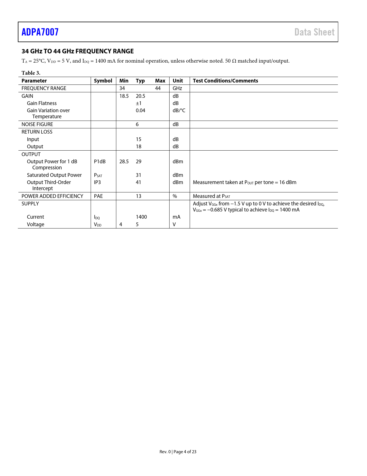 ADPA7007. Data Sheet. 34 GHz TO 44 GHz FREQUENCY RANGE. Table 3. Parameter. Symbol Min. Typ. Max. Unit. Test Conditions/Comments