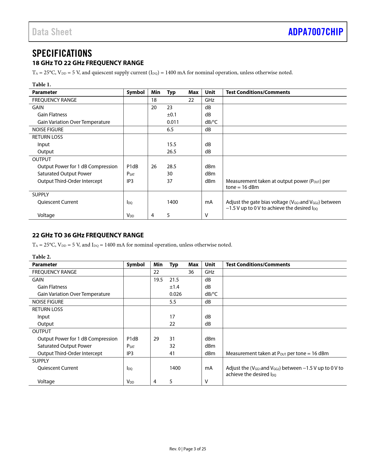 Pages / Page25 / 3 — Data Sheet. ADPA7007CHIP. SPECIFICATIONS 18 GHz TO 22 GHz FREQUENCY …