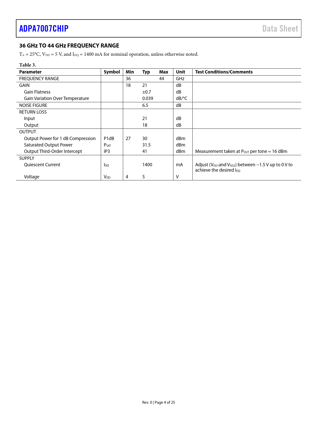 ADPA7007CHIP. Data Sheet. 36 GHz TO 44 GHz FREQUENCY RANGE. Table 3. Parameter. Symbol Min. Typ. Max. Unit. Test Conditions/Comments