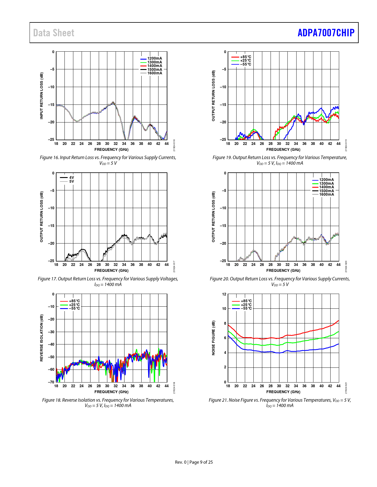 Data SheetADPA7007CHIP001200mA+85°C1300mA+25°C1400mA–55°C–51500mA–5B)B)1600mAdd((SSSSOO–10–10URN LURN LTT–15RE–15REUTUTPINPUT O–20–20–25–251820222426283032343638404244 016 1820222426283032343638404244 019 FREQUENCY (GHz) 21924- FREQUENCY (GHz) 21924- Figure 16. Input Return Loss vs. Frequency for Various Supply Currents, Figure 19. Output Return Loss vs. Frequency for Various Temperature, VDD = 5 V VDD = 5 V, IDQ = 1400 mA 004V 5V1200mA 1300mA 1400mA–5–51500mAB)B)dd1600mA((SSSSOO–10–10URN LURN LTTRE–15RE–15UTUTPPUTUTOO–20–20–25–251820222426283032343638404244 017 1820222426283032343638404244 020 FREQUENCY (GHz) 21924- FREQUENCY (GHz) 21924- Figure 17. Output Return Loss vs. Frequency for Various Supply Voltages, Figure 20. Output Return Loss vs. Frequency for Various Supply Currents, IDQ = 1400 mA VDD = 5 V 012+85°C+85°C+25°C+25°C–10–55°C10–55°C) B–20(d)N8dBIO(TEA–30RL6SO–40FIGU ESE IOIS N4EVER–50R2–60–7001820222426283032343638404244 018 1820222426283032343638404244 021 FREQUENCY (GHz) 21924- FREQUENCY (GHz) 21924- Figure 18. Reverse Isolation vs. Frequency for Various Temperatures, Figure 21. Noise Figure vs. Frequency for Various Temperatures, VDD = 5 V, VDD = 5 V, IDQ = 1400 mA IDQ = 1400 mA Rev. 0 | Page 9 of 25 Document Outline FEATURES APPLICATIONS FUNCTIONAL BLOCK DIAGRAM GENERAL DESCRIPTION TABLE OF CONTENTS REVISION HISTORY SPECIFICATIONS 18 GHz TO 22 GHz FREQUENCY RANGE 22 GHz TO 36 GHz FREQUENCY RANGE 36 GHz TO 44 GHz FREQUENCY RANGE ABSOLUTE MAXIMUM RATINGS THERMAL RESISTANCE ELECTROSTATIC DISCHARGE (ESD) RATINGS ESD Ratings ADPA7007CHIP ESD CAUTION PIN CONFIGURATION AND FUNCTION DESCRIPTIONS INTERFACE SCHEMATICS TYPICAL PERFORMANCE CHARACTERISTICS CONSTANT IDD OPERATION THEORY OF OPERATION APPLICATIONS INFORMATION MOUNTING AND BONDING TECHNIQUES FOR MILLIMETERWAVE GAAS MMICS Handling Precautions Mounting Wire Bonding BIASING ADPA7007CHIP WITH THE HMC980LP4E APPLICATION CIRCUIT SETUP LIMITING VGATE FOR ADPA7007CHIP VGGx ABSOLUTE MAXIMUM RATING REQUIREMENT HMC980LP4E BIAS SEQUENCE Power-Up Sequence Power-Down Sequence CONSTANT DRAIN CURRENT BIASING vs. CONSTANT GATE VOLTAGE BIASING TYPICAL APPLICATION CIRCUIT ASSEMBLY DIAGRAM OUTLINE DIMENSIONS ORDERING GUIDE