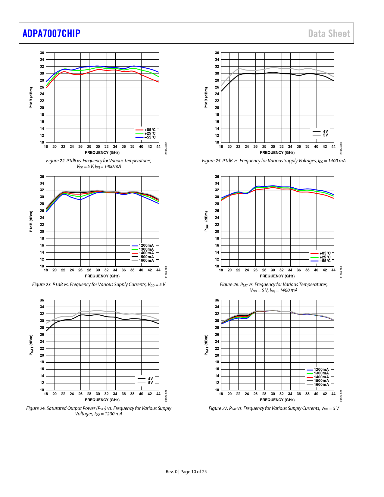 ADPA7007CHIP Data Sheet 36 36 34 34 32 32 30 30 28 28 26 26 Bm) Bm) d 24 24 d B ( 22 B ( 22 1d 1d P 20 P 20 18 18 16 16 14 +85°C 14 4V +25°C 12 5V –55°C 12 10 10 18 20 22 24 26 28 30 32 34 36 38 40 42 44