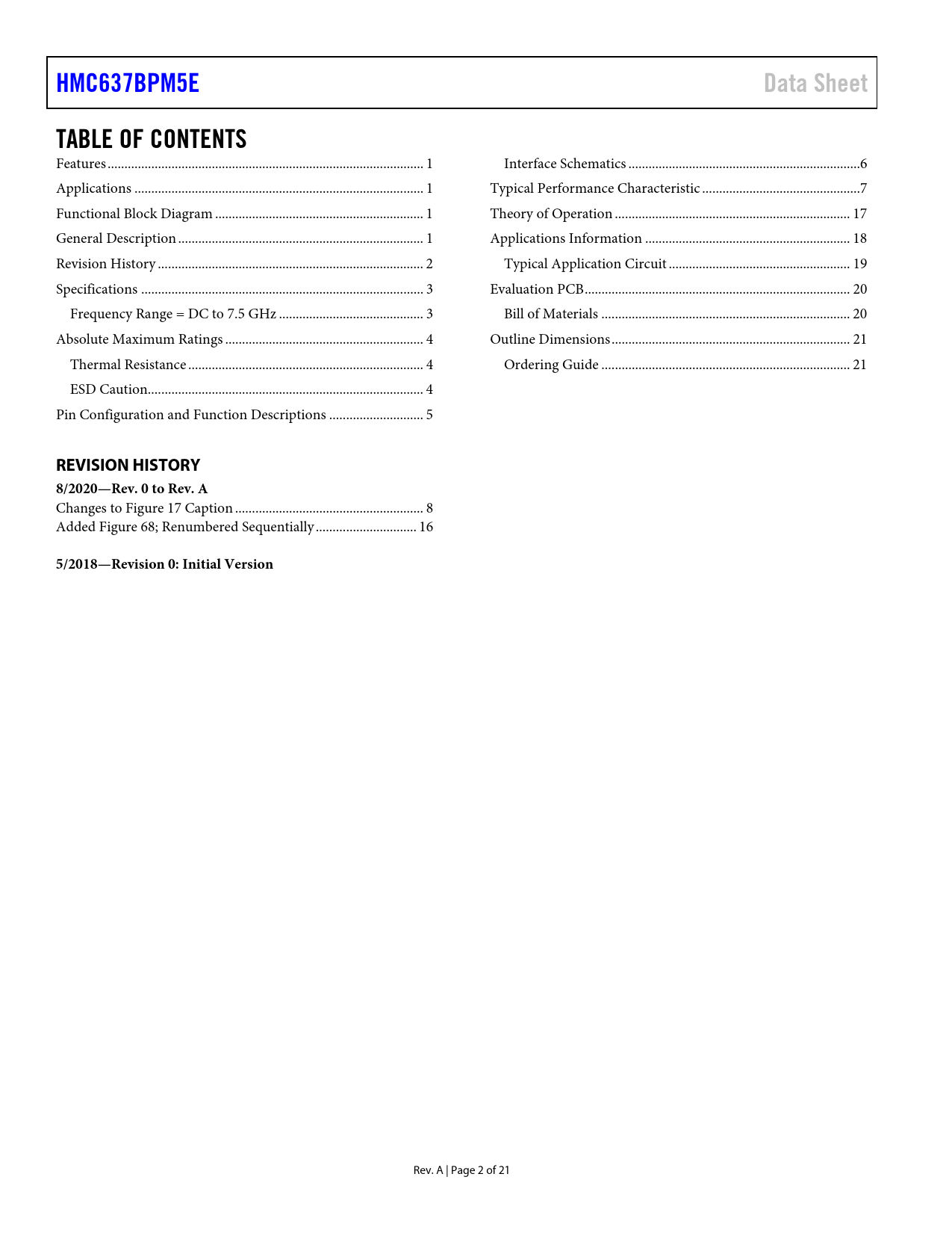 Pages / Page21 / 2 — HMC637BPM5E. Data Sheet. TABLE OF CONTENTS. REVISION HISTORY 8/2020—Rev. …