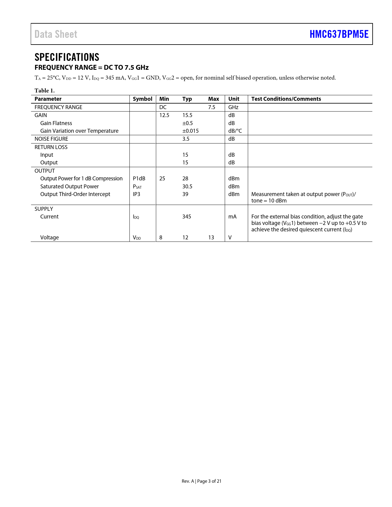 Data SheetHMC637BPM5ESPECIFICATIONS FREQUENCY RANGE = DC TO 7.5 GHz TA = 25°C, VDD = 12 V, IDQ = 345 mA, VGG1 = GND, VGG2 = open, for nominal self biased operation, unless otherwise noted. Table 1. ParameterSymbol MinTypMaxUnitTest Conditions/Comments FREQUENCY RANGE DC 7.5 GHz GAIN 12.5 15.5 dB Gain Flatness ±0.5 dB Gain Variation over Temperature ±0.015 dB/°C NOISE FIGURE 3.5 dB RETURN LOSS Input 15 dB Output 15 dB OUTPUT Output Power for 1 dB Compression P1dB 25 28 dBm Saturated Output Power PSAT 30.5 dBm Output Third-Order Intercept IP3 39 dBm Measurement taken at output power (POUT)/ tone = 10 dBm SUPPLY Current IDQ 345 mA For the external bias condition, adjust the gate bias voltage (VGG1) between −2 V up to +0.5 V to achieve the desired quiescent current (IDQ) Voltage VDD 8 12 13 V Rev. A | Page 3 of 21 Document Outline FEATURES APPLICATIONS FUNCTIONAL BLOCK DIAGRAM GENERAL DESCRIPTION TABLE OF CONTENTS REVISION HISTORY SPECIFICATIONS FREQUENCY RANGE = DC TO 7.5 GHz ABSOLUTE MAXIMUM RATINGS THERMAL RESISTANCE ESD CAUTION PIN CONFIGURATION AND FUNCTION DESCRIPTIONS INTERFACE SCHEMATICS TYPICAL PERFORMANCE CHARACTERISTIC THEORY OF OPERATION APPLICATIONS INFORMATION TYPICAL APPLICATION CIRCUIT EVALUATION PCB BILL OF MATERIALS OUTLINE DIMENSIONS ORDERING GUIDE