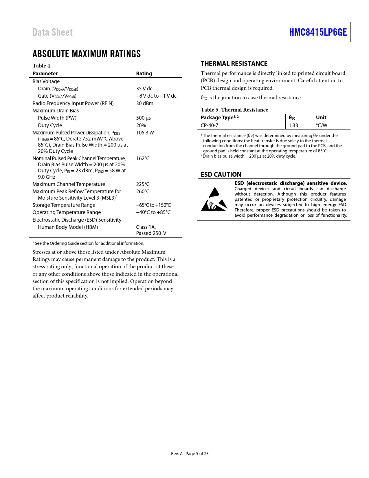 Data Sheet. HMC8415LP6GE. ABSOLUTE MAXIMUM RATINGS Table 4. THERMAL RESISTANCE. Parameter. Rating. Table 5. Thermal Resistance
