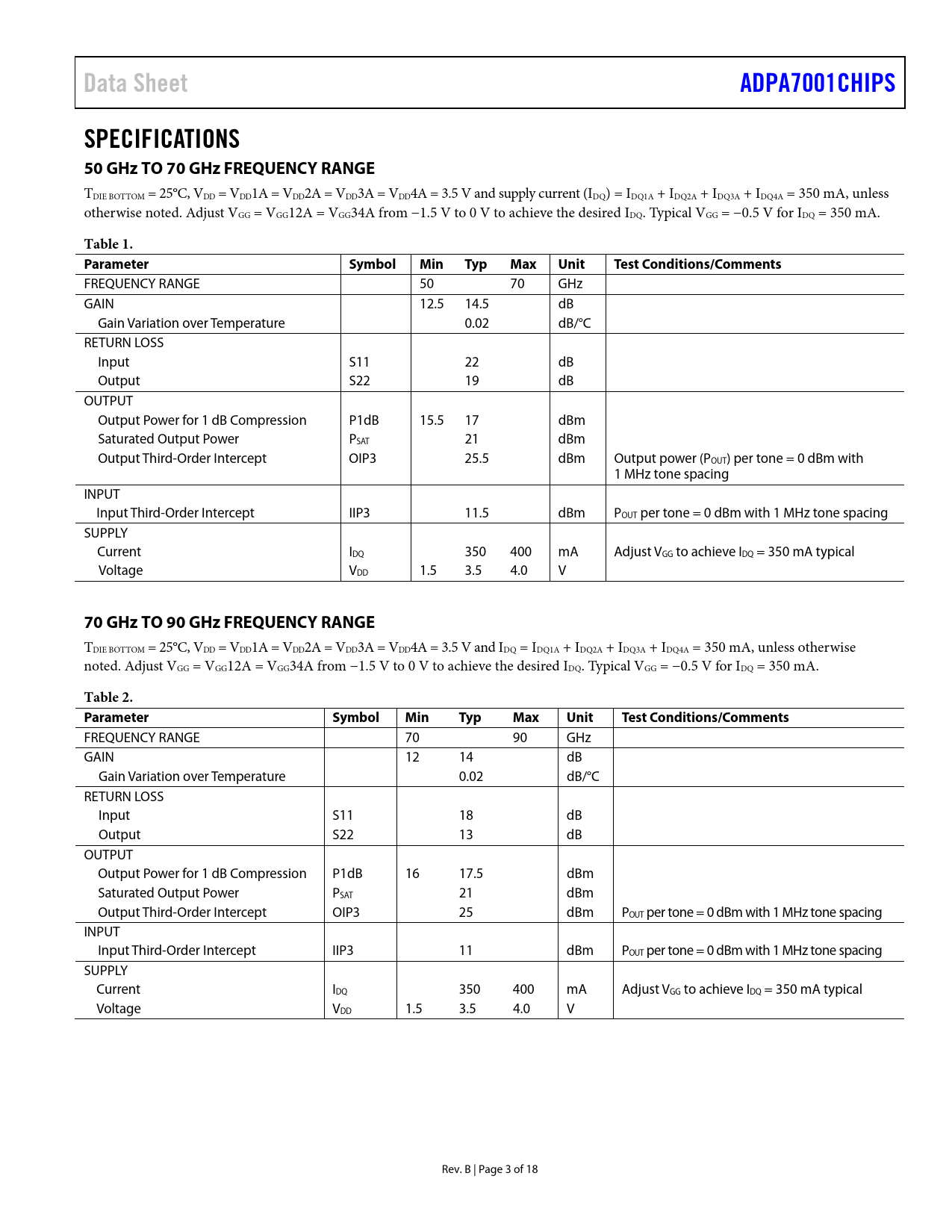 Data SheetADPA7001CHIPSSPECIFICATIONS 50 GHz TO 70 GHz FREQUENCY RANGE TDIE BOTTOM = 25°C, VDD = VDD1A = VDD2A = VDD3A = VDD4A = 3.5 V and supply current (IDQ) = IDQ1A + IDQ2A + IDQ3A + IDQ4A = 350 mA, unless otherwise noted. Adjust VGG = VGG12A = VGG34A from −1.5 V to 0 V to achieve the desired IDQ. Typical VGG = −0.5 V for IDQ = 350 mA. Table 1. Parameter SymbolMinTypMaxUnitTestConditions/Comments FREQUENCY RANGE 50 70 GHz GAIN 12.5 14.5 dB Gain Variation over Temperature 0.02 dB/°C RETURN LOSS Input S11 22 dB Output S22 19 dB OUTPUT Output Power for 1 dB Compression P1dB 15.5 17 dBm Saturated Output Power PSAT 21 dBm Output Third-Order Intercept OIP3 25.5 dBm Output power (POUT) per tone = 0 dBm with 1 MHz tone spacing INPUT Input Third-Order Intercept IIP3 11.5 dBm POUT per tone = 0 dBm with 1 MHz tone spacing SUPPLY Current IDQ 350 400 mA Adjust VGG to achieve IDQ = 350 mA typical Voltage VDD 1.5 3.5 4.0 V 70 GHz TO 90 GHz FREQUENCY RANGE TDIE BOTTOM = 25°C, VDD = VDD1A = VDD2A = VDD3A = VDD4A = 3.5 V and IDQ = IDQ1A + IDQ2A + IDQ3A + IDQ4A = 350 mA, unless otherwise noted. Adjust VGG = VGG12A = VGG34A from −1.5 V to 0 V to achieve the desired IDQ. Typical VGG = −0.5 V for IDQ = 350 mA. Table 2. Parameter SymbolMinTypMaxUnitTestConditions/Comments FREQUENCY RANGE 70 90 GHz GAIN 12 14 dB Gain Variation over Temperature 0.02 dB/°C RETURN LOSS Input S11 18 dB Output S22 13 dB OUTPUT Output Power for 1 dB Compression P1dB 16 17.5 dBm Saturated Output Power PSAT 21 dBm Output Third-Order Intercept OIP3 25 dBm POUT per tone = 0 dBm with 1 MHz tone spacing INPUT Input Third-Order Intercept IIP3 11 dBm POUT per tone = 0 dBm with 1 MHz tone spacing SUPPLY Current IDQ 350 400 mA Adjust VGG to achieve IDQ = 350 mA typical Voltage VDD 1.5 3.5 4.0 V Rev. B | Page 3 of 18 Document Outline FEATURES APPLICATIONS FUNCTIONAL BLOCK DIAGRAM GENERAL DESCRIPTION REVISION HISTORY SPECIFICATIONS 50 GHz TO 70 GHz FREQUENCY RANGE 70 GHz TO 90 GHz FREQUENCY RANGE 90 GHz TO 95 GHz FREQUENCY RANGE ABSOLUTE MAXIMUM RATINGS THERMAL RESISTANCE ESD CAUTION PIN CONFIGURATION AND FUNCTION DESCRIPTIONS INTERFACE SCHEMATICS TYPICAL PERFORMANCE CHARACTERISTICS THEORY OF OPERATION APPLICATIONS INFORMATION MOUNTING AND BONDING TECHNIQUES FOR MILLIMETERWAVE GaAs MMICS Handling Precautions Mounting Wire Bonding TYPICAL APPLICATION CIRCUIT ASSEMBLY DIAGRAM OUTLINE DIMENSIONS ORDERING GUIDE
