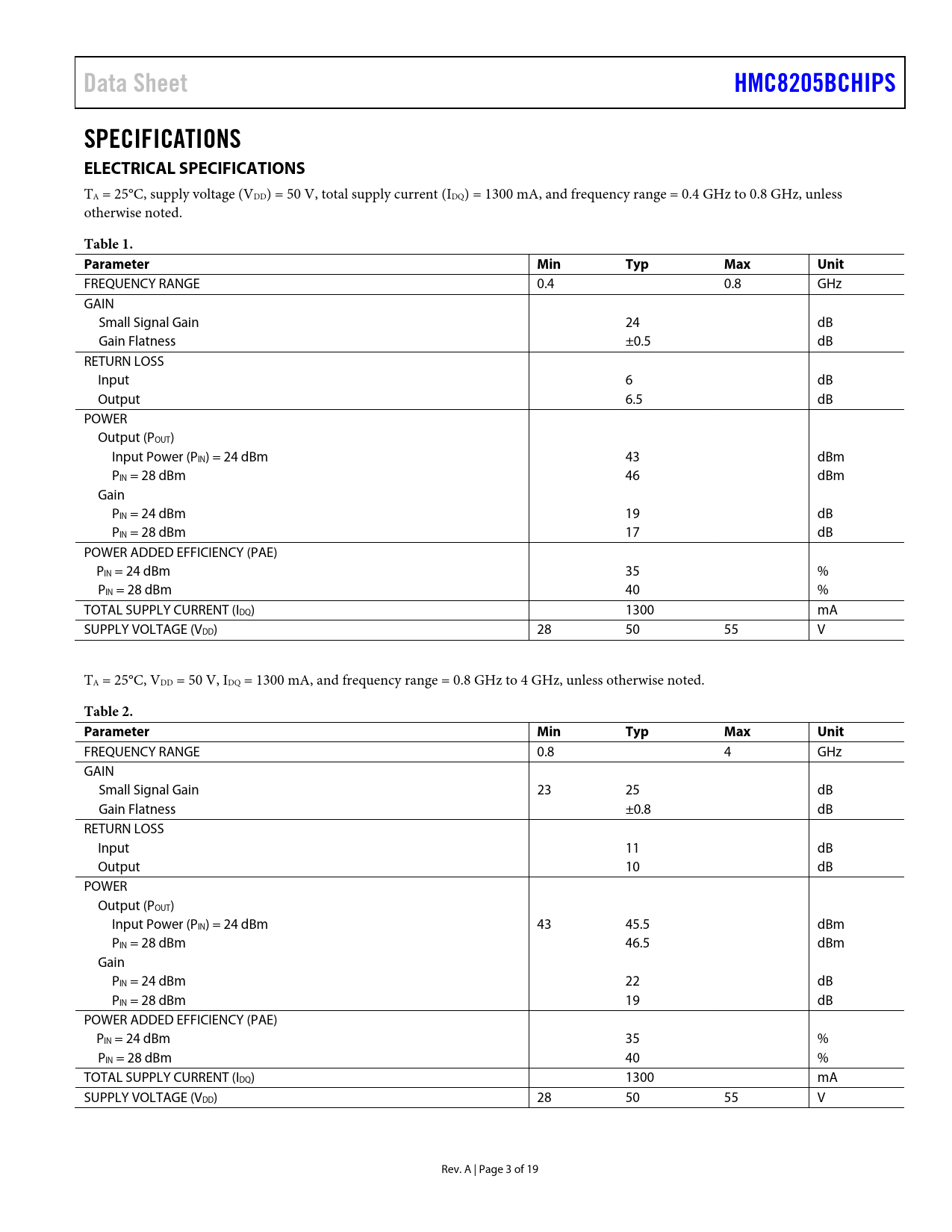 Data SheetHMC8205BCHIPSSPECIFICATIONS ELECTRICAL SPECIFICATIONS TA = 25°C, supply voltage (VDD) = 50 V, total supply current (IDQ) = 1300 mA, and frequency range = 0.4 GHz to 0.8 GHz, unless otherwise noted. Table 1. ParameterMinTypMaxUnit FREQUENCY RANGE 0.4 0.8 GHz GAIN Small Signal Gain 24 dB Gain Flatness ±0.5 dB RETURN LOSS Input 6 dB Output 6.5 dB POWER Output (POUT) Input Power (PIN) = 24 dBm 43 dBm PIN = 28 dBm 46 dBm Gain PIN = 24 dBm 19 dB PIN = 28 dBm 17 dB POWER ADDED EFFICIENCY (PAE) PIN = 24 dBm 35 % PIN = 28 dBm 40 % TOTAL SUPPLY CURRENT (IDQ) 1300 mA SUPPLY VOLTAGE (VDD) 28 50 55 V TA = 25°C, VDD = 50 V, IDQ = 1300 mA, and frequency range = 0.8 GHz to 4 GHz, unless otherwise noted. Table 2. ParameterMinTypMaxUnit FREQUENCY RANGE 0.8 4 GHz GAIN Small Signal Gain 23 25 dB Gain Flatness ±0.8 dB RETURN LOSS Input 11 dB Output 10 dB POWER Output (POUT) Input Power (PIN) = 24 dBm 43 45.5 dBm PIN = 28 dBm 46.5 dBm Gain PIN = 24 dBm 22 dB PIN = 28 dBm 19 dB POWER ADDED EFFICIENCY (PAE) PIN = 24 dBm 35 % PIN = 28 dBm 40 % TOTAL SUPPLY CURRENT (IDQ) 1300 mA SUPPLY VOLTAGE (VDD) 28 50 55 V Rev. A | Page 3 of 19 Document Outline FEATURES APPLICATIONS FUNCTIONAL BLOCK DIAGRAM GENERAL DESCRIPTION TABLE OF CONTENTS REVISION HISTORY SPECIFICATIONS ELECTRICAL SPECIFICATIONS ABSOLUTE MAXIMUM RATINGS THERMAL RESISTANCE ESD CAUTION PIN CONFIGURATION AND FUNCTION DESCRIPTION INTERFACE SCHEMATICS TYPICAL PERFORMANCE CHARACTERISTICS THEORY OF OPERATION APPLICATIONS INFORMATION RECOMMENDED BIAS SEQUENCING MOUNTING AND BONDING TECHNIQUES FOR MILLIMETERWAVE GaAs MMICS Handling Precautions TYPICAL APPLICATION CIRCUIT ASSEMBLY DIAGRAM OUTLINE DIMENSIONS ORDERING GUIDE