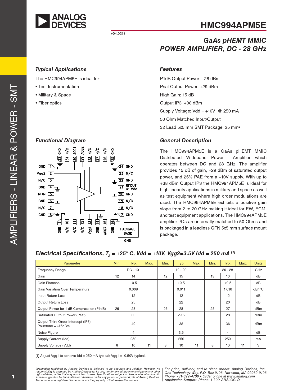 HMC994APM5E. GaAs pHEMT MMIC. POWER AMPLIFIER, DC - 28 GHz. Typical Applications. Features. Functional Diagram. General Description