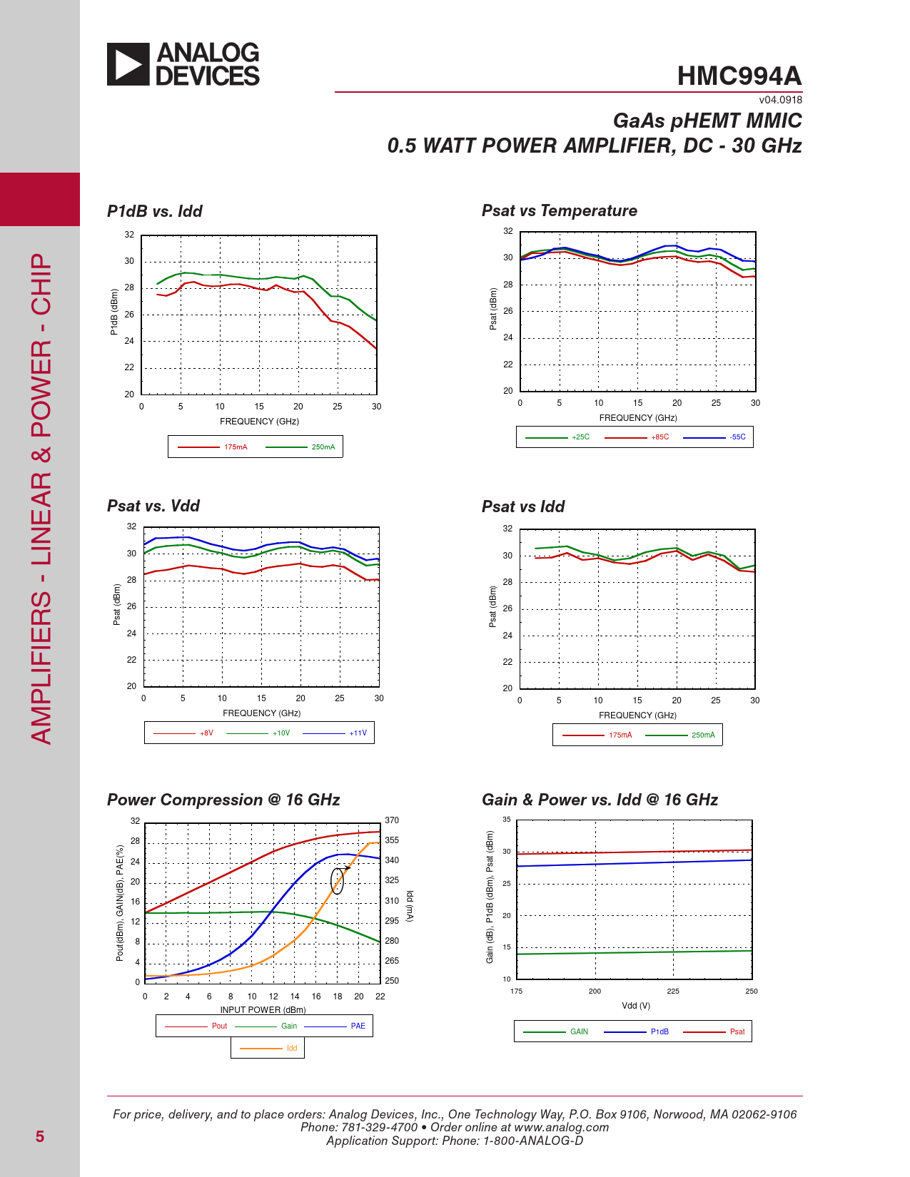 HMC994A v04.0918 GaAs pHEMT MMIC0.5 WATT POWER AMPLIFIER, DC - 30 GHzP1dB vs. IddPsat vs Temperature 32 32 IP 30 30 H 28 28 ) m 26 (dB 26 at s P1dB (dBm) P R - C 24 24 E 22 22 W 20 20 O 0 5 10 15 20 25 30 0 5 10 15 20 25 30 FREQUENCY (GHz) FREQUENCY (GHz) +25C +85C -55C 175mA 250mA R & P A E Psat vs. VddPsat vs Idd 32 IN 32 30 30 28 28 S - L ) m m R (dB 26 (dB 26 at s at P s P IE 24 24 22 22 LIF P 20 20 0 5 10 15 20 25 30 0 5 10 15 20 25 30 M FREQUENCY (GHz) FREQUENCY (GHz) A +8V +10V +11V 175mA 250mA Power Compression @ 16 GHzGain & Power vs. Idd @ 16 GHz 32 370 35 ) m 28 355 ) % 30 (dB 24 340 at s , PAE( ), P 20 325 B) I m 25 (d dd N 16 310 ( (dB AI m A ) 1dB 20 ), G 12 295 ), P Bm 8 280 t(d (dB u n 15 ai Po 4 265 G 0 250 10 175 200 225 250 0 2 4 6 8 10 12 14 16 18 20 22 Vdd (V) INPUT POWER (dBm) Pout Gain PAE GAIN P1dB Psat Idd For price, delivery, and to place orders: Analog Devices, Inc., One Technology Way, P.O. Box 9106, Norwood, MA 02062-9106 Phone: 781-329-4700 • Order online at www.analog.com 5 Application Support: Phone: 1-800-ANALOG-D Document Outline Typical Applications Features Functional Diagram General Description Electrical Specifications Performance Characteristics Gain & Return Loss Input Return Loss vs. Temperature Second Harmonics vs. Temperature @ Pout = 14 dBm, Vdd = 10V & Vgg = 3.5V, 175 mA Absolute Maximum Ratings Pad Descriptions Assembly Diagram Application Circuit
