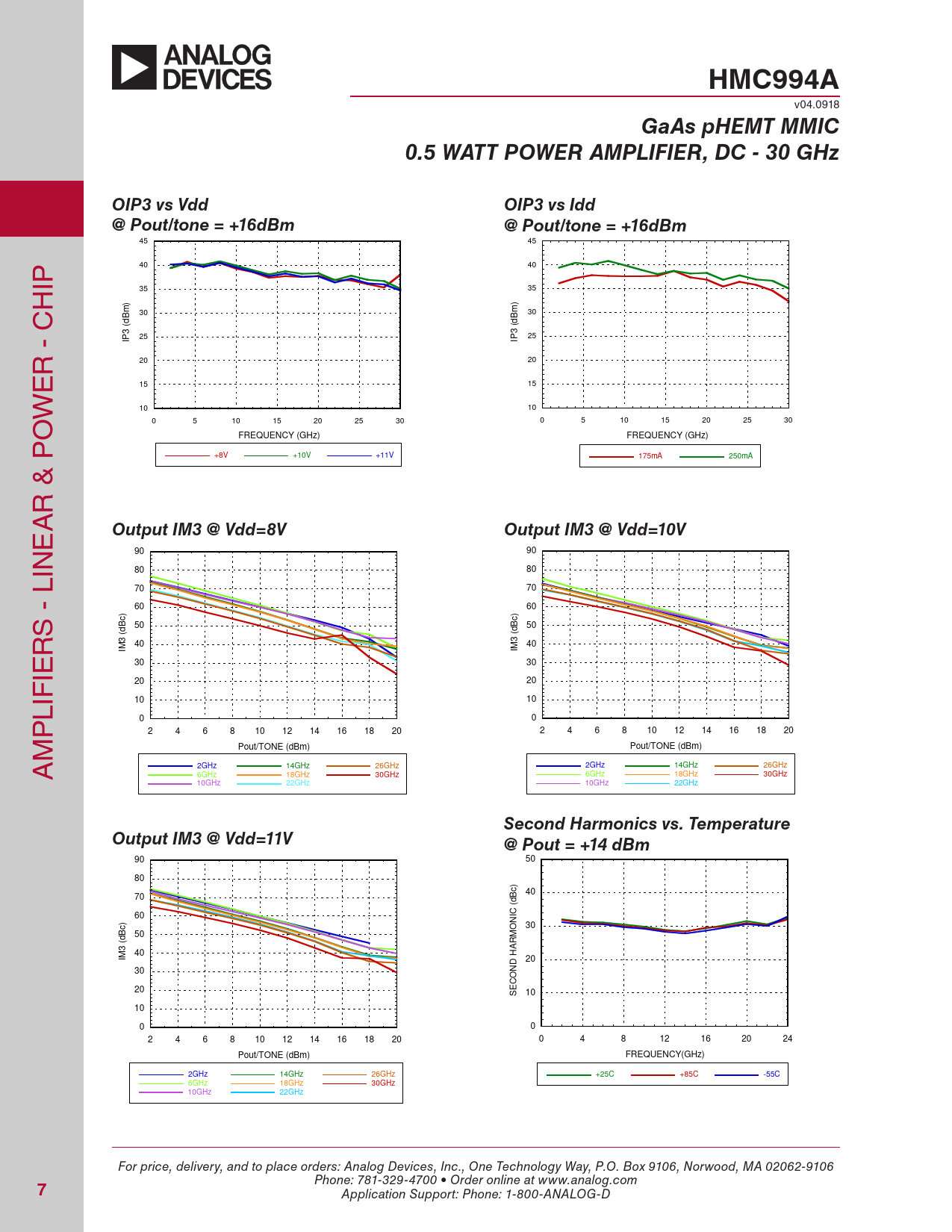 HMC994A v04.0918 GaAs pHEMT MMIC0.5 WATT POWER AMPLIFIER, DC - 30 GHzOIP3 vs VddOIP3 vs Idd@ Pout/tone = +16dBm@ Pout/tone = +16dBm 45 45 IP 40 40 H 35 35 ) m 30 m 30 (dB (dB 3 3 25 IP 25 IP R - C 20 20 E 15 15 W 10 10 O 0 5 10 15 20 25 30 0 5 10 15 20 25 30 FREQUENCY (GHz) FREQUENCY (GHz) +8V +10V +11V 175mA 250mA R & P A E Output IM3 @ Vdd=8VOutput IM3 @ Vdd=10V 90 90 IN 80 80 70 70 60 60 S - L ) c c 50 50 R (dB (dB 3 3 40 40 IM IM IE 30 30 20 20 LIF 10 10 P 0 0 2 4 6 8 10 12 14 16 18 20 2 4 6 8 10 12 14 16 18 20 M Pout/TONE (dBm) Pout/TONE (dBm) A 2GHz 14GHz 26GHz 2GHz 14GHz 26GHz 6GHz 18GHz 30GHz 6GHz 18GHz 30GHz 10GHz 22GHz 10GHz 22GHz Second Harmonics vs. TemperatureOutput IM3 @ Vdd=11V@ Pout = +14 dBm 90 50 80 ) c 40 70 B (d C 60 ) NI c O 30 50 (dB RM 3 40 IM HA 20 30 ND O C 20 E S 10 10 0 0 2 4 6 8 10 12 14 16 18 20 0 4 8 12 16 20 24 Pout/TONE (dBm) FREQUENCY(GHz) 2GHz 14GHz 26GHz +25C +85C -55C 6GHz 18GHz 30GHz 10GHz 22GHz For price, delivery, and to place orders: Analog Devices, Inc., One Technology Way, P.O. Box 9106, Norwood, MA 02062-9106 Phone: 781-329-4700 • Order online at www.analog.com 7 Application Support: Phone: 1-800-ANALOG-D Document Outline Typical Applications Features Functional Diagram General Description Electrical Specifications Performance Characteristics Gain & Return Loss Input Return Loss vs. Temperature Second Harmonics vs. Temperature @ Pout = 14 dBm, Vdd = 10V & Vgg = 3.5V, 175 mA Absolute Maximum Ratings Pad Descriptions Assembly Diagram Application Circuit