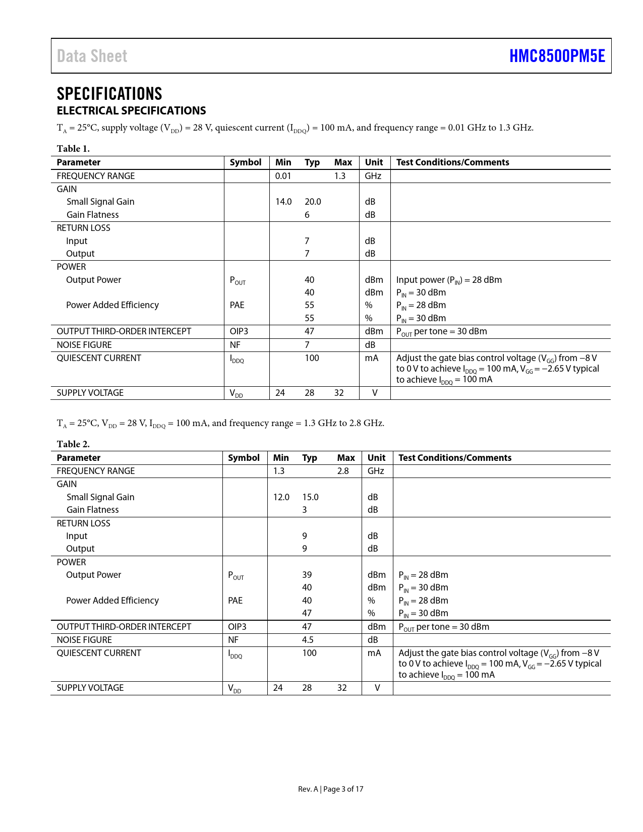 Pages / Page17 / 3 — Data Sheet. HMC8500PM5E. SPECIFICATIONS ELECTRICAL SPECIFICATIONS. Table …