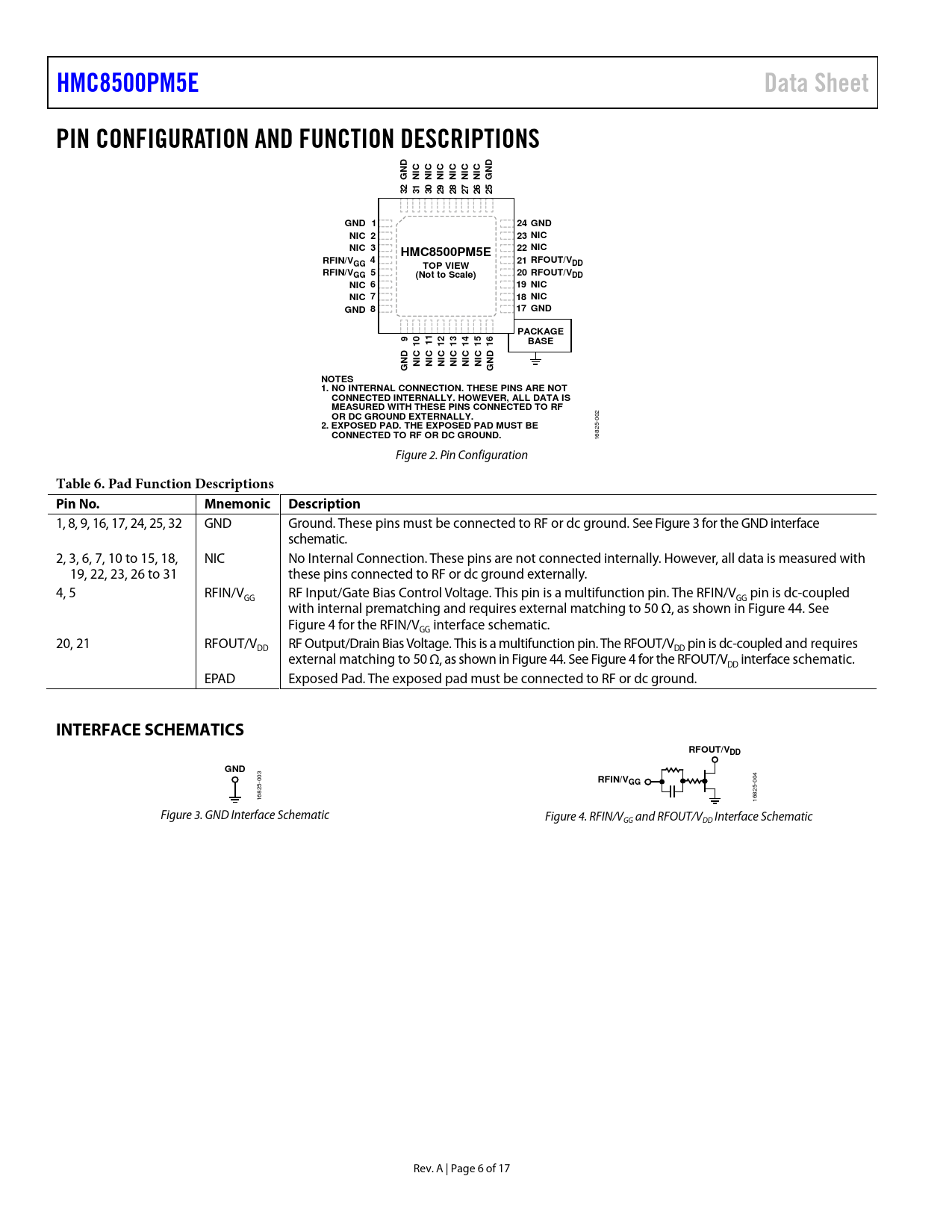 Pages / Page17 / 6 — HMC8500PM5E. Data Sheet. PIN CONFIGURATION AND FUNCTION DESCRIPTIONS. GND …