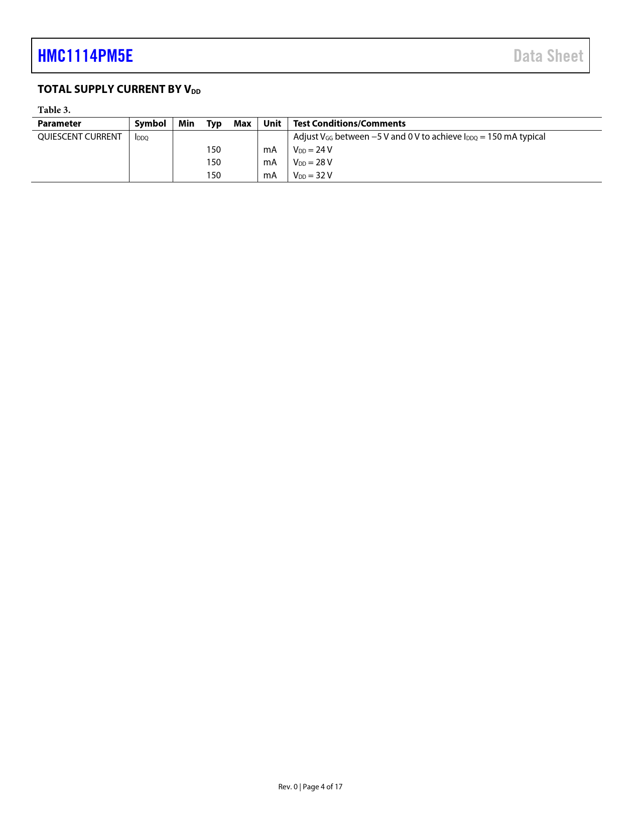 HMC1114PM5EData SheetTOTAL SUPPLY CURRENT BY VDDTable 3. ParameterSymbol Min Typ Max Unit Test Conditions/Comments QUIESCENT CURRENT IDDQ Adjust VGG between −5 V and 0 V to achieve IDDQ = 150 mA typical 150 mA VDD = 24 V 150 mA VDD = 28 V 150 mA VDD = 32 V Rev. 0 | Page 4 of 17 Document Outline FEATURES APPLICATIONS FUNCTIONAL BLOCK DIAGRAM GENERAL DESCRIPTION TABLE OF CONTENTS REVISION HISTORY SPECIFICATIONS ELECTRICAL SPECIFICATIONS TOTAL SUPPLY CURRENT BY VDD ABSOLUTE MAXIMUM RATINGS THERMAL RESISTANCE ESD CAUTION PIN CONFIGURATION AND FUNCTION DESCRIPTIONS INTERFACE SCHEMATICS TYPICAL PERFORMANCE CHARACTERISTICS THEORY OF OPERATION APPLICATIONS INFORMATION RECOMMENDED BIAS SEQUENCE During Power-Up During Power-Down TYPICAL APPLICATION CIRCUIT EVALUATION PCB OUTLINE DIMENSIONS ORDERING GUIDE