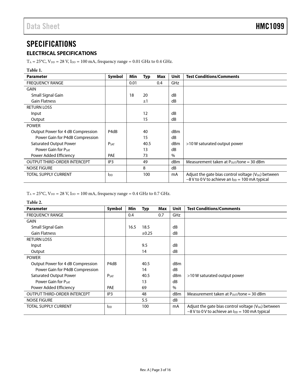 Pages / Page16 / 3 — Data Sheet. HMC1099. SPECIFICATIONS ELECTRICAL SPECIFICATIONS. Table 1. …