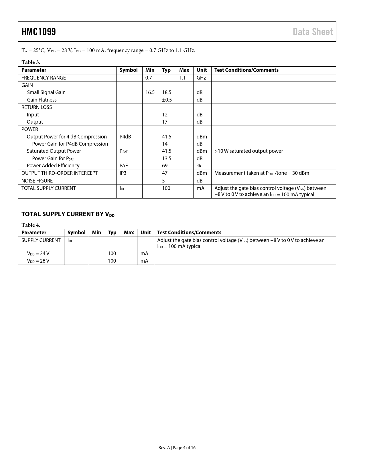 Pages / Page16 / 4 — HMC1099. Data Sheet. Table 3. Parameter. Symbol. Min. Typ. Max. Unit. …
