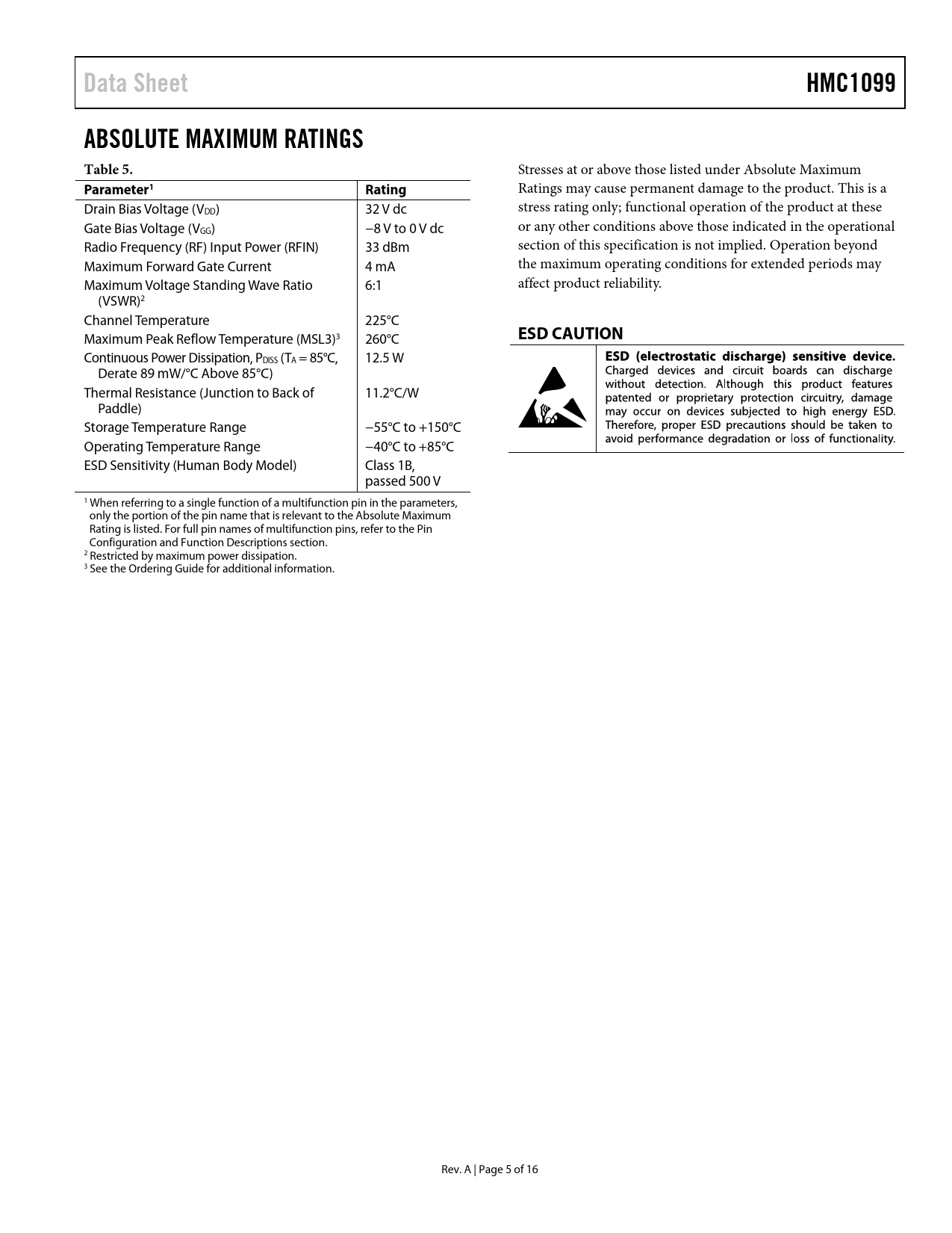 link to page 6 link to page 6 link to page 16 Data SheetHMC1099ABSOLUTE MAXIMUM RATINGS Table 5. Stresses at or above those listed under Absolute Maximum Parameter1Rating Ratings may cause permanent damage to the product. This is a Drain Bias Voltage (VDD) 32 V dc stress rating only; functional operation of the product at these Gate Bias Voltage (VGG) −8 V to 0 V dc or any other conditions above those indicated in the operational Radio Frequency (RF) Input Power (RFIN) 33 dBm section of this specification is not implied. Operation beyond Maximum Forward Gate Current 4 mA the maximum operating conditions for extended periods may Maximum Voltage Standing Wave Ratio 6:1 affect product reliability. (VSWR)2 Channel Temperature 225°C Maximum Peak Reflow Temperature (MSL3)3 260°C ESD CAUTION Continuous Power Dissipation, PDISS (TA = 85°C, 12.5 W Derate 89 mW/°C Above 85°C) Thermal Resistance (Junction to Back of 11.2°C/W Paddle) Storage Temperature Range −55°C to +150°C Operating Temperature Range −40°C to +85°C ESD Sensitivity (Human Body Model) Class 1B, passed 500 V 1 When referring to a single function of a multifunction pin in the parameters, only the portion of the pin name that is relevant to the Absolute Maximum Rating is listed. For full pin names of multifunction pins, refer to the Pin Configuration and Function Descriptions section. 2 Restricted by maximum power dissipation. 3 See the Ordering Guide for additional information. Rev. A | Page 5 of 16 Document Outline FEATURES APPLICATIONS GENERAL DESCRIPTION FUNCTIONAL BLOCK DIAGRAM REVISION HISTORY SPECIFICATIONS ELECTRICAL SPECIFICATIONS TOTAL SUPPLY CURRENT BY VDD ABSOLUTE MAXIMUM RATINGS ESD CAUTION PIN CONFIGURATION AND FUNCTION DESCRIPTIONS INTERFACE SCHEMATICS TYPICAL PERFORMANCE CHARACTERISTICS THEORY OF OPERATION APPLICATIONS INFORMATION TYPICAL APPLICATION CIRCUIT EVALUATION PCB BILL OF MATERIALS OUTLINE DIMENSIONS ORDERING GUIDE