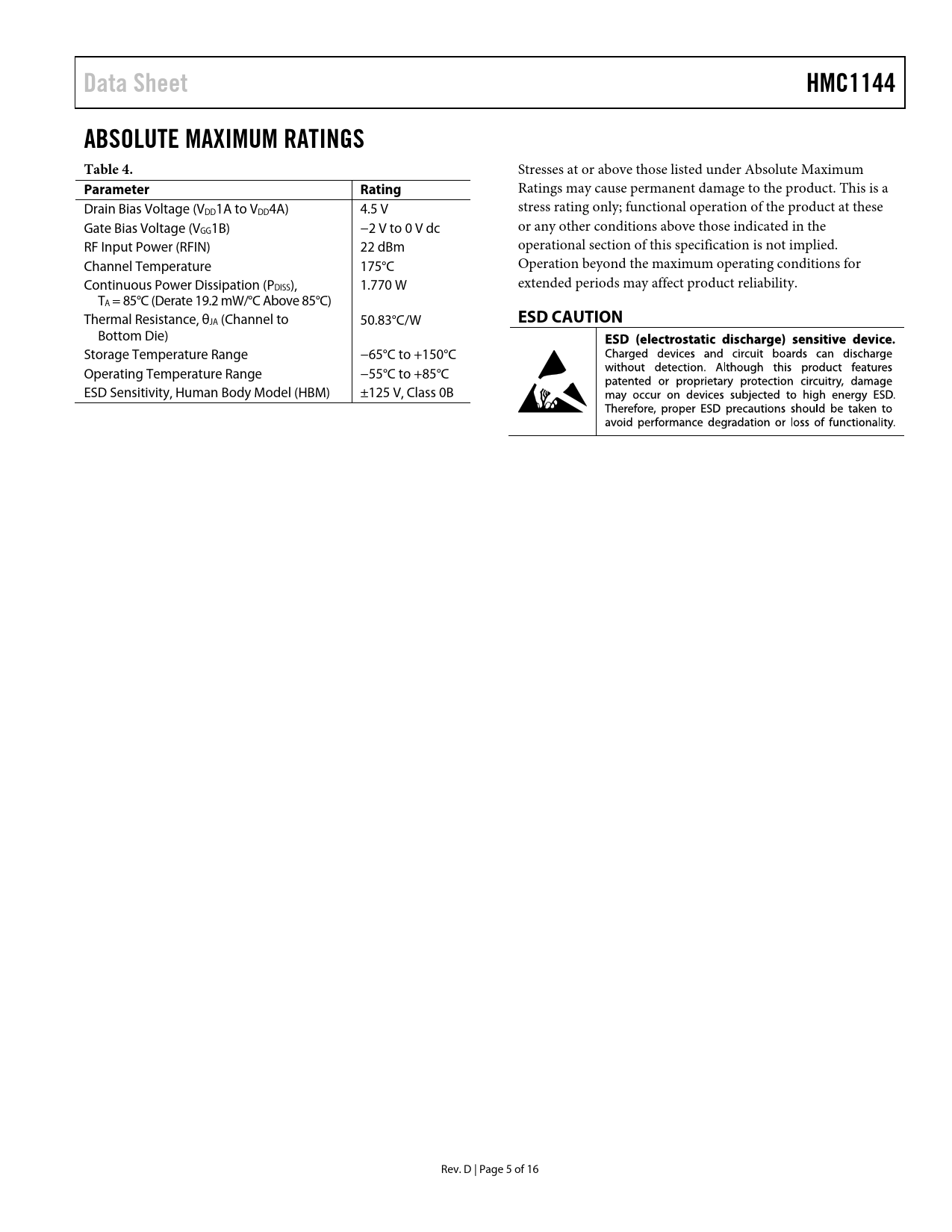 Data Sheet HMC1144 ABSOLUTE MAXIMUM RATINGS Table 4 Parameter Rating ESD CAUTION