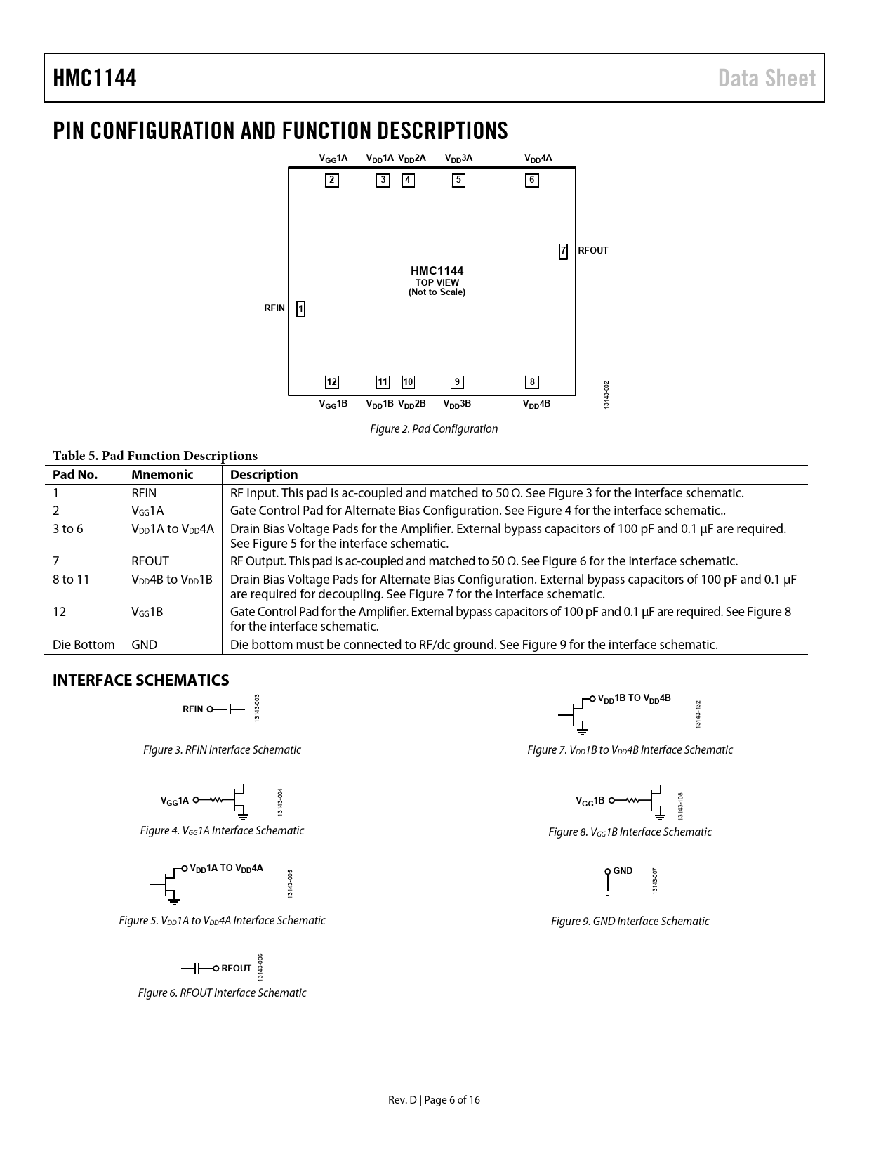 1 RFIN RF Input. This pad is ac-coupled and matched to 50 Ω. See Figure 3 for the interface schematic. 2 VGG1A Gate Control Pad for Alternate Bias Configuration. See Figure 4 for the interface schematic.. 3 to 6 VDD1A to VDD4A Drain Bias Voltage Pads for the Amplifier. External bypass capacitors of 100 pF and 0.1 μF are required. See Figure 5 for the interface schematic. 7 RFOUT RF Output. This pad is ac-coupled and matched to 50 Ω. See Figure 6 for the interface schematic. 8 to 11 VDD4B to VDD1B Drain Bias Voltage Pads for Alternate Bias Configuration. External bypass capacitors of 100 pF and 0.1 μF are required for decoupling. See Figure 7 for the interface schematic. 12 VGG1B Gate Control Pad for the Amplifier. External bypass capacitors of 100 pF and 0.1 μF are required. See Figure 8 for the interface schematic. Die Bottom GND Die bottom must be connected to RF/dc ground. See Figure 9 for the interface schematic.