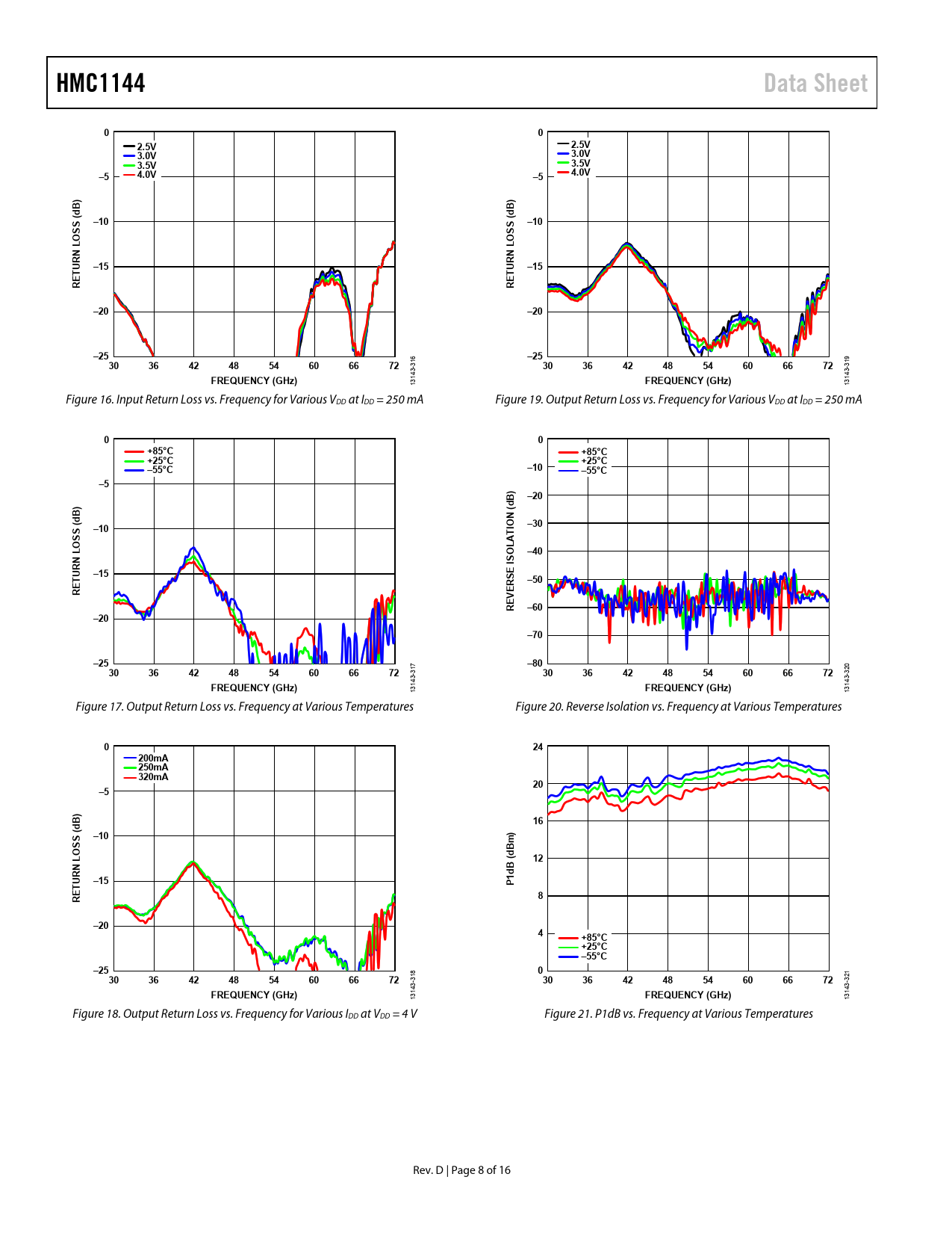 HMC1144Data Sheet002.5V2.5V3.0V3.0V3.5V3.5V–54.0V4.0V–5B)B)(d(dS–10S–10SSOOLLNNUR–15UR–15TTRERE–20–20–25 6 –25 9 3036424854606672 31 3036424854606672 31 3- 3- FREQUENCY (GHz) 1314 FREQUENCY (GHz) 1314 Figure 16. Input Return Loss vs. Frequency for Various VDD at IDD = 250 mA Figure 19. Output Return Loss vs. Frequency for Various VDD at IDD = 250 mA 00+85°C+85°C+25°C+25°C–55°C–10–55°C–5) B–20B)(d N(dIO–30S–10TSAOLL–40NISOUR–15TSE–50REEVER R–60–20–70–25 7 –80 0 3036424854606672 31 3036424854606672 32 3- 3- FREQUENCY (GHz) 1314 FREQUENCY (GHz) 1314 Figure 17. Output Return Loss vs. Frequency at Various Temperatures Figure 20. Reverse Isolation vs. Frequency at Various Temperatures 024200mA250mA320mA20–5B)16(d)S–10SmOdBL(12URN–151dBTPRE8–204+85°C+25°C–55°C–25 8 0 1 3036424854606672 31 3036424854606672 32 3- 3- FREQUENCY (GHz) 1314 FREQUENCY (GHz) 1314 Figure 18. Output Return Loss vs. Frequency for Various IDD at VDD = 4 V Figure 21. P1dB vs. Frequency at Various Temperatures Rev. D | Page 8 of 16 Document Outline FEATURES APPLICATIONS FUNCTIONAL BLOCK DIAGRAM GENERAL DESCRIPTION TABLE OF CONTENTS REVISION HISTORY ELECTRICAL SPECIFICATIONS 35 GHz TO 40 GHz FREQUENCY RANGE 40 GHz TO 50 GHz FREQUENCY RANGE 50 GHz TO 70 GHz FREQUENCY RANGE ABSOLUTE MAXIMUM RATINGS ESD CAUTION PIN CONFIGURATION AND FUNCTION DESCRIPTIONS INTERFACE SCHEMATICS TYPICAL PERFORMANCE CHARACTERISTICS THEORY OF OPERATION APPLICATIONS INFORMATION ALTERNATE BIASING CONFIGURATION MOUNTING AND BONDING TECHNIQUES FOR MILLIMETERWAVE GaAs MMICS Handling Precautions Mounting Wire Bonding TYPICAL APPLICATION CIRCUIT ASSEMBLY DIAGRAM OUTLINE DIMENSIONS ORDERING GUIDE