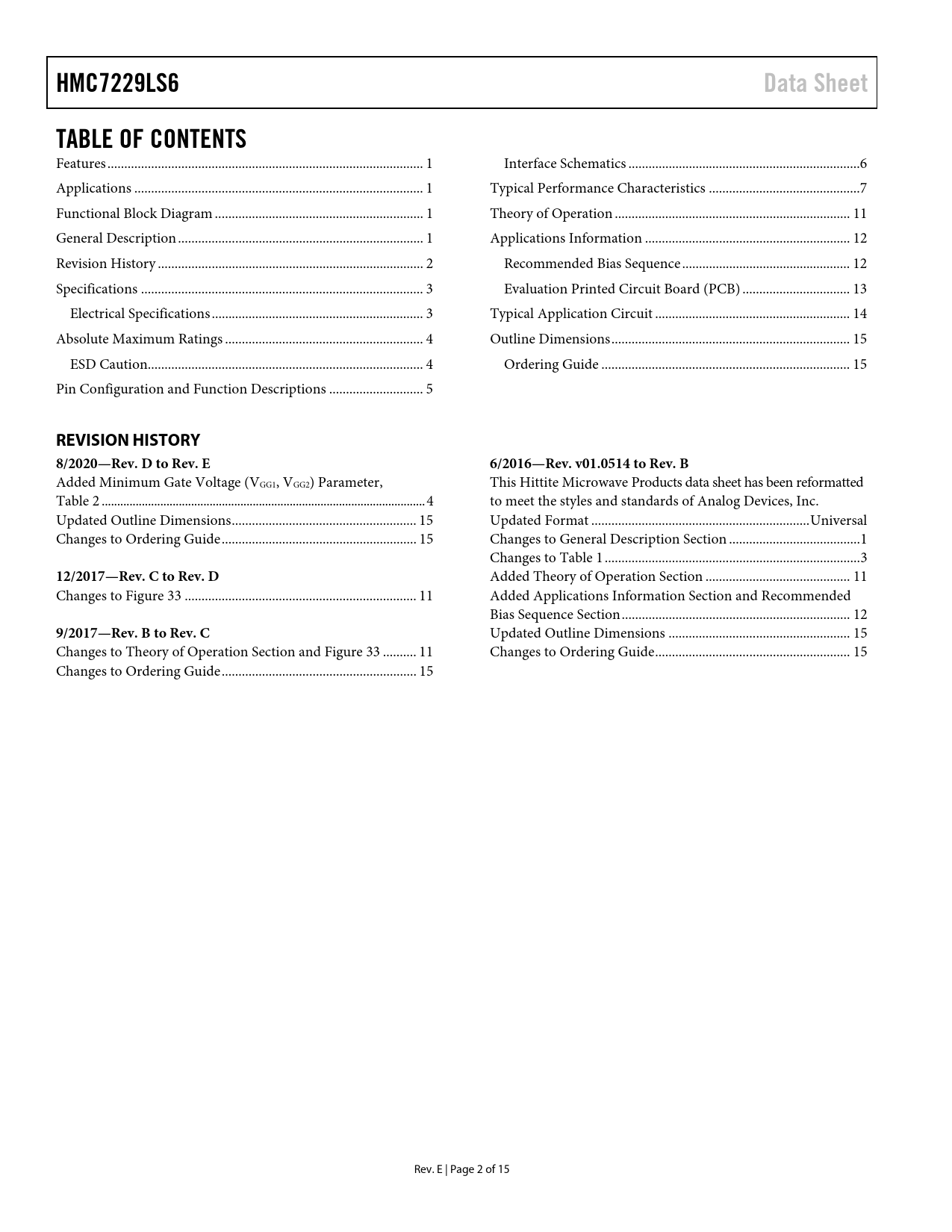 HMC7229LS6 Data Sheet TABLE OF CONTENTS REVISION HISTORY 8/2020—Rev D to Rev E 6/2016—Rev v01.0514 to Rev B